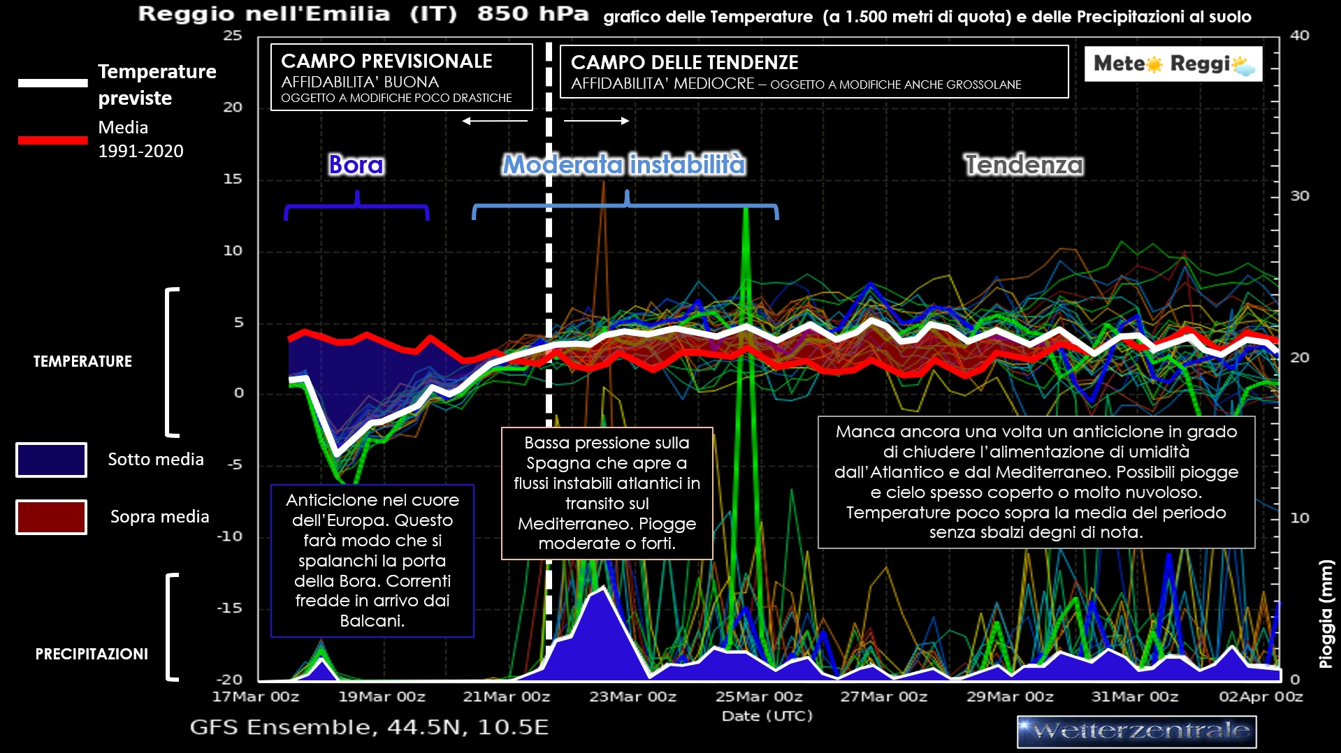Già dalla serata di lunedì 17 marzo, un impulso di aria fredda inizierà a fluire dalla porta della Bora con raffiche via via più sostenute. Il primo impatto dell'aria fredda potrebbe portare un breve momento di instabilità, con deboli piogge intermittenti che interesseranno in particolare l’Appennino reggiano e, successivamente per poco tempo, la Pianura. Tuttavia, si tratterà di fenomeni di brevissima durata.