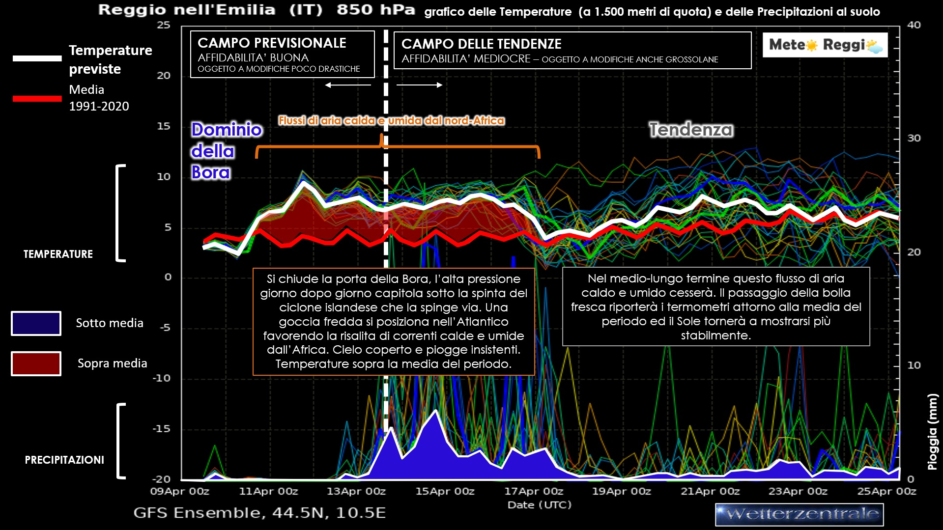 Facciamo un passo indietro. Domenica 6 aprile abbiamo assistito a un evento meteorologico piuttosto curioso: nonostante la presenza dell’alta pressione, si è aperta temporaneamente la “porta della Bora” sul versante est dell’Italia. Una corrente di aria fredda e secca ha attraversato velocemente la Pianura Padana, portando con sé un drastico calo delle temperature, qualche nube e nessuna pioggia. A Reggio Emilia si è passati in poche ore da massime attorno ai 24°C in Pianura a valori di poco superiori ai 12°C, con minime che localmente sono scese sotto i 4°C e in Montagna sotto lo zero. Una fiammata invernale improvvisa, ma destinata a durare poco.