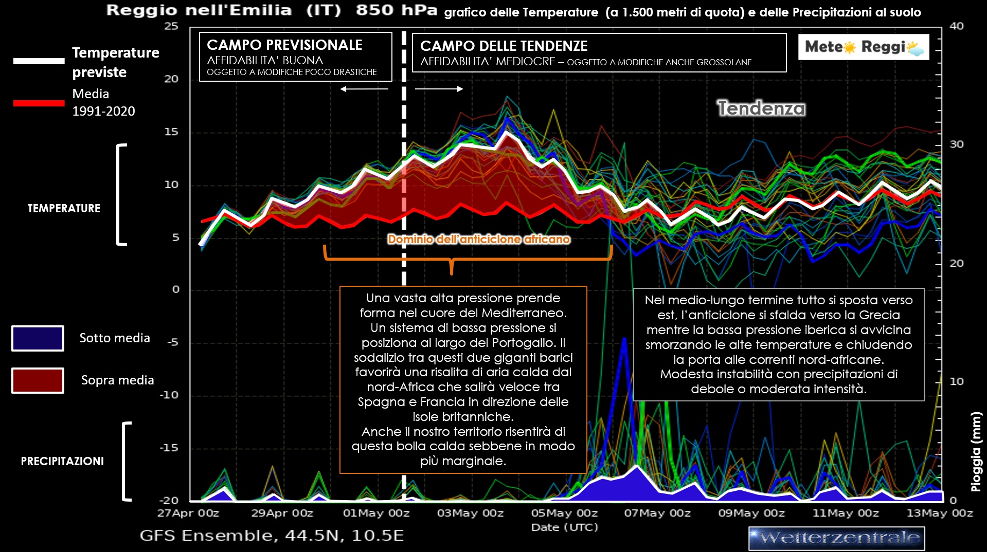 Come evidenziato nel grafico a "spaghetti" (immagine 1), tra il 2 e il 3 maggio è atteso un netto rialzo termico anche sulla provincia di Reggio Emilia, con valori massimi che potrebbero facilmente superare i +26°C (o anche più) nelle ore più calde del giorno. Si tratterà di un anticipo d’estate che porterà cieli sereni o poco nuvolosi e condizioni di tempo decisamente stabile. Le notti rimarranno ancora gradevoli, grazie a minime contenute attorno ai +12/+14°C, ma durante il giorno si percepirà un sensibile aumento del calore, soprattutto nelle aree urbane e pianeggianti con la complicità dell'umidità alta.