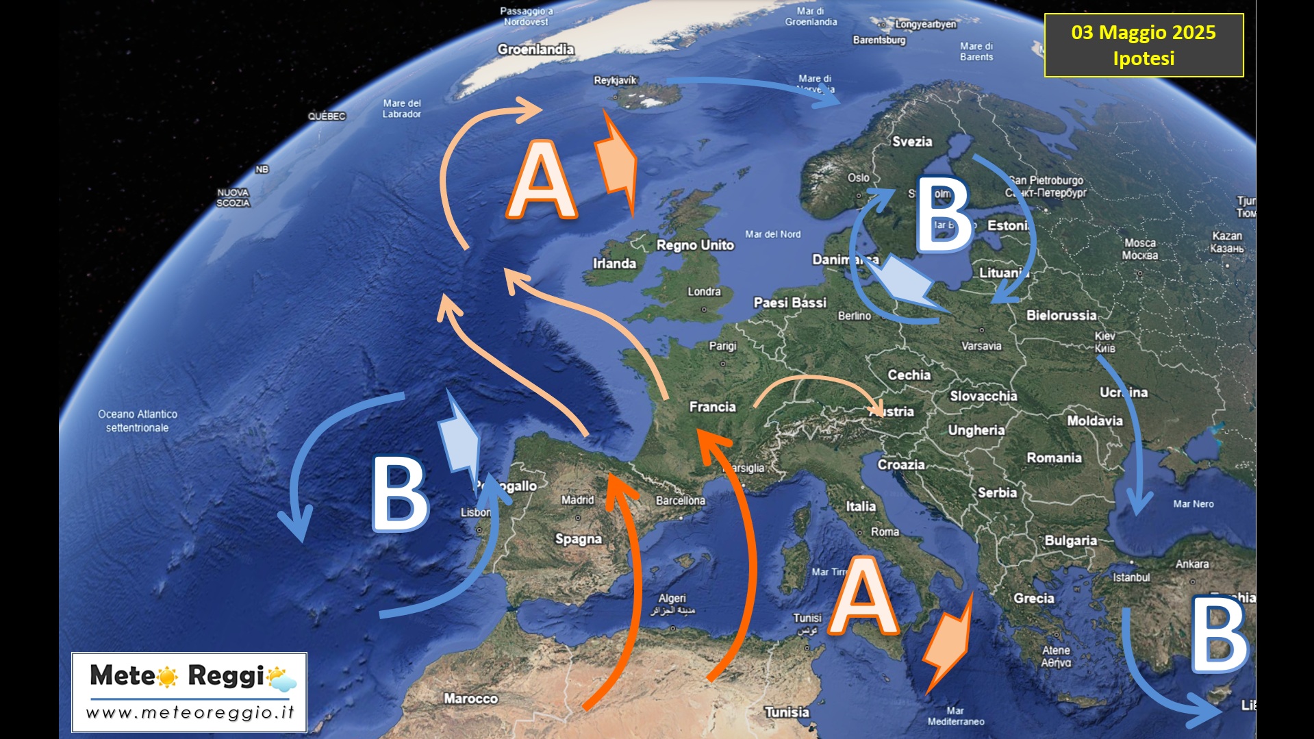 Tuttavia, questa fase di stabilità atmosferica non sarà destinata a durare a lungo. Secondo l’ipotesi tracciata nella seconda immagine (scenario sinottico del 3 maggio), già nel corso del fine settimana o nei primissimi giorni della nuova settimana (a partire dal 5 maggio) il quadro meteorologico tenderà nuovamente a cambiare. L’anticiclone, infatti, tenderà a spostarsi progressivamente verso sud-est, in direzione della Grecia e del Mar Egeo, perdendo parte della sua compattezza. Contestualmente, la depressione iberica avanzerà verso est, avvicinandosi alla Penisola e aprendo la porta a correnti più umide e instabili.