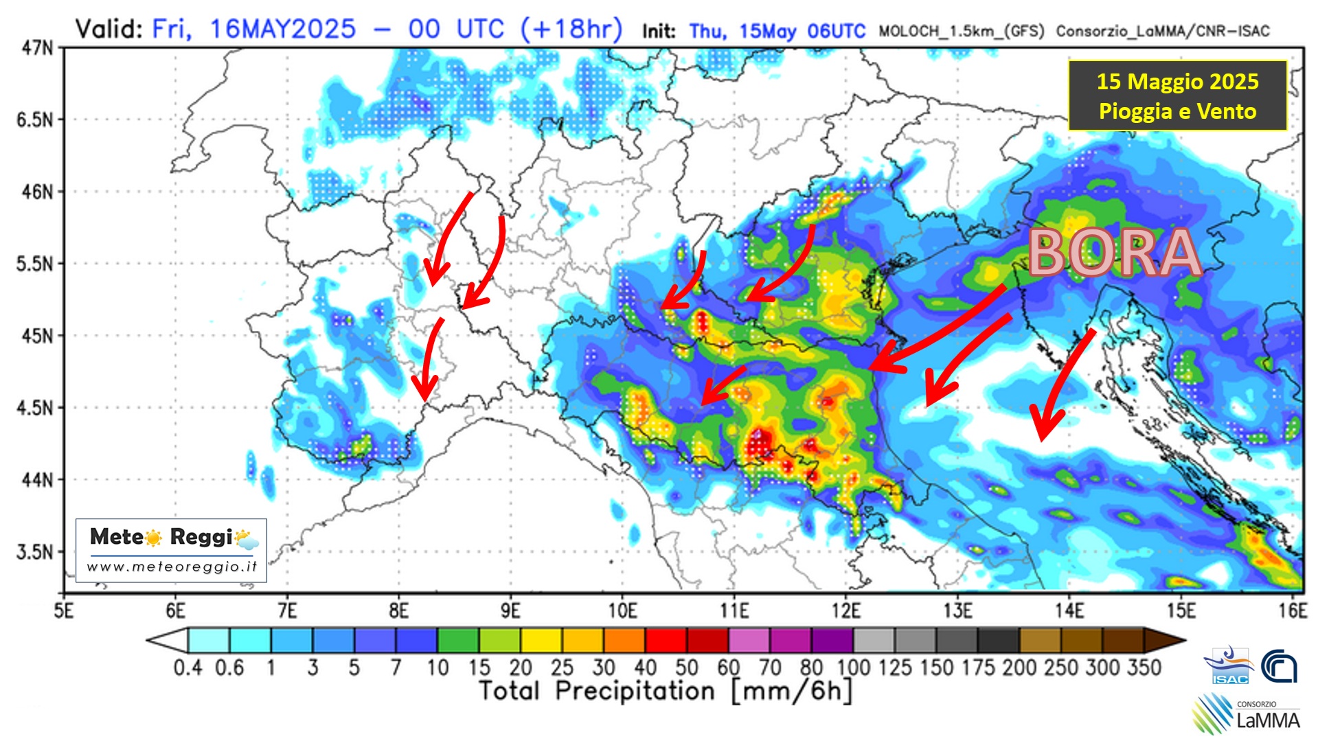 Nel corso del pomeriggio e della sera del 15 maggio, questa massa d’aria fredda — in parte bloccata dalle Alpi — troverà sfogo attraverso due vie principali: la valle dell’Adige e la cosiddetta "porta della Bora", tra Slovenia e alto Adriatico. Proprio da quest’ultima varco, i venti si incanaleranno con decisione, attivando raffiche impetuose di Bora in discesa verso il Friuli, il Veneto e l’Emilia orientale.