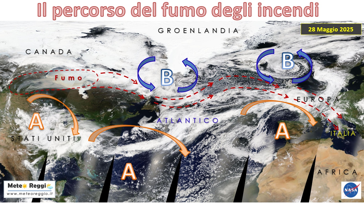 Una volta che il particolato raggiunge queste quote elevate, può venire catturato e trasportato dai flussi atmosferici dominanti. Ed è proprio questo che sta accadendo: un’estesa area depressionaria situata presso il Circolo Polare Artico, combinata con un promontorio di alta pressione sull’Atlantico centrale, sta creando un corridoio perfetto per il trasporto del fumo verso l’Europa occidentale.