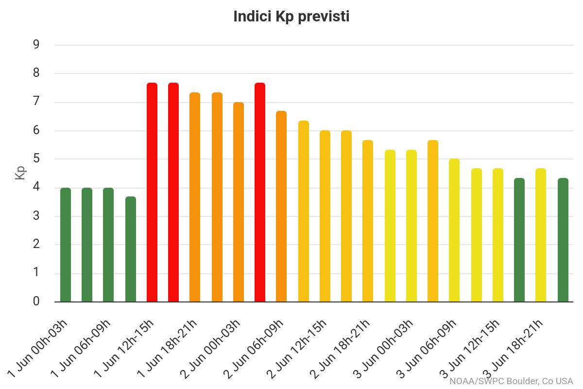 Secondo il NOAA, l’agenzia statunitense per l’atmosfera e gli oceani, ci troviamo di fronte a una tempesta geomagnetica di livello G4, con un indice Kp previsto intorno a 8: un valore molto alto, indicativo di una perturbazione magnetica estesa e intensa dell’ambiente circumterrestre.