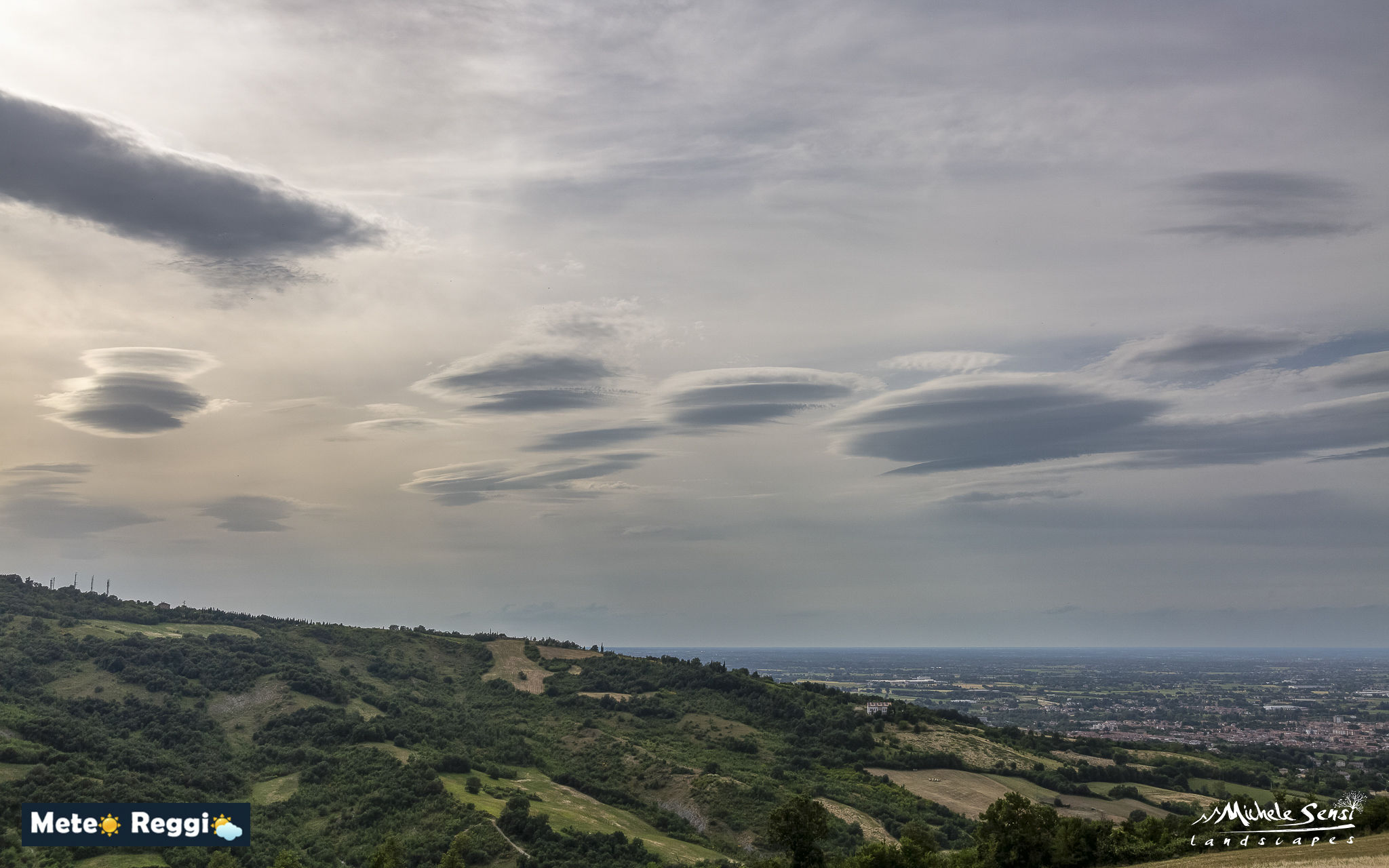 Le splendide immagini che abbiamo di fronte ci offrono uno spettacolo celeste davvero particolare, catturato sopra le colline reggiane. A un primo sguardo, il cielo appare come velato, con un'insolita colorazione lattiginosa. Ma l'attenzione viene subito catturata, volgendo lo sguardo sull'Appennino, da alcune formazioni nuvolose davvero affascinanti, che sembrano quasi degli oggetti volanti non identificati!