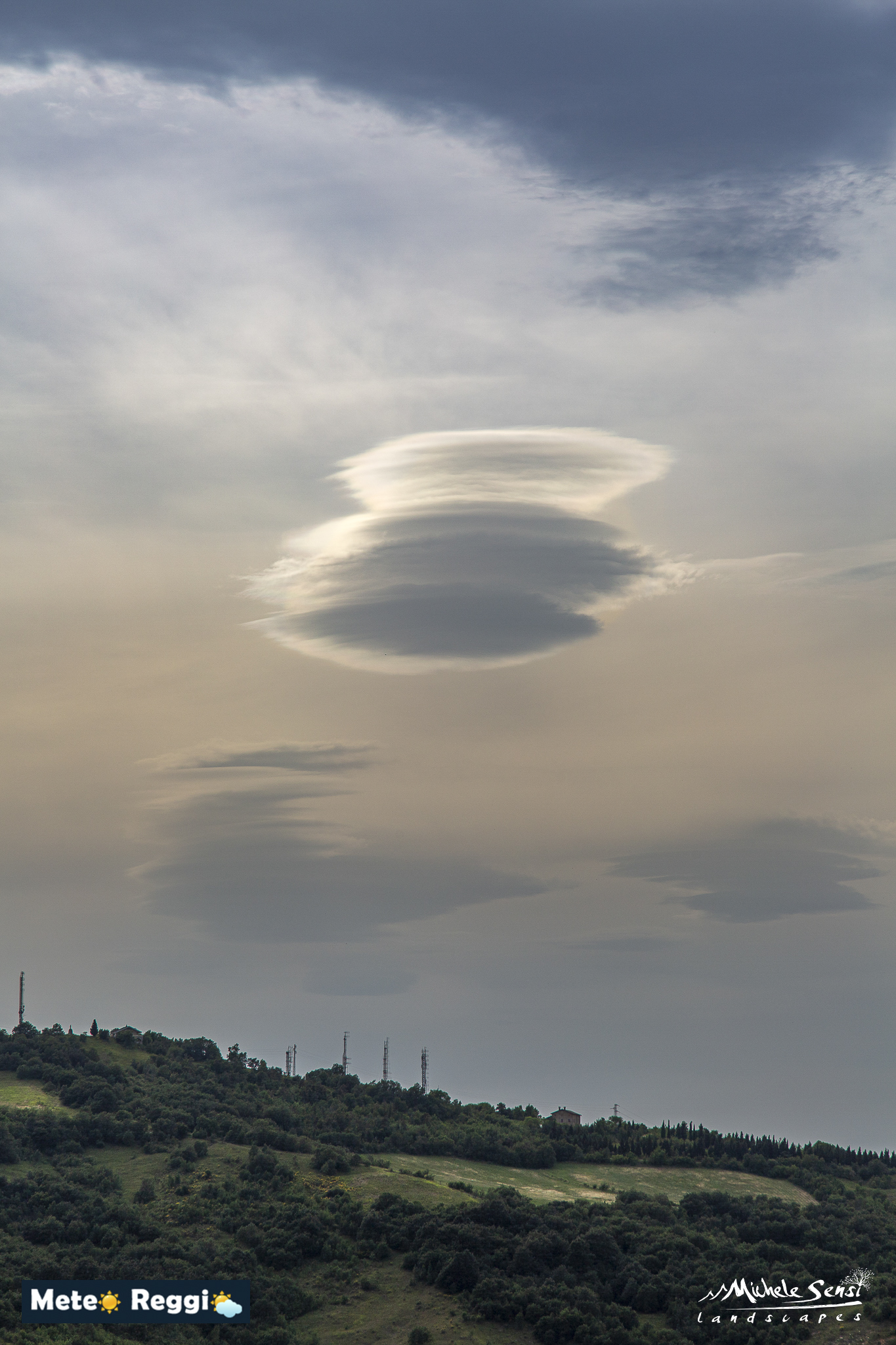 Le splendide immagini che abbiamo di fronte ci offrono uno spettacolo celeste davvero particolare, catturato sopra le colline reggiane. A un primo sguardo, il cielo appare come velato, con un'insolita colorazione lattiginosa. Ma l'attenzione viene subito catturata, volgendo lo sguardo sull'Appennino, da alcune formazioni nuvolose davvero affascinanti, che sembrano quasi degli oggetti volanti non identificati! e che da qualche giorno stazionano tra Crinale e Collina.