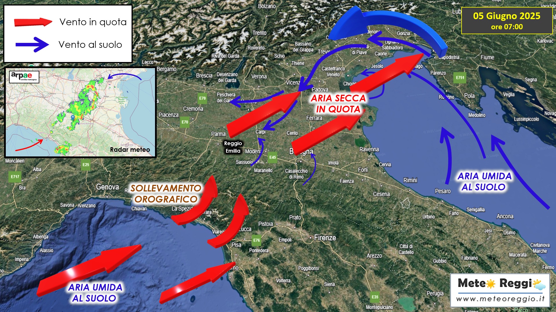 Dal Mar Adriatico, una corrente d’aria umida e tiepida (indicata in blu nella mappa) si muove a livello del suolo verso l’interno, entrando da nord-est. Questa corrente viene canalizzata nella pianura e, impattando contro le Prealpi venete e friulane, è costretta a rallentare e in parte sollevarsi.