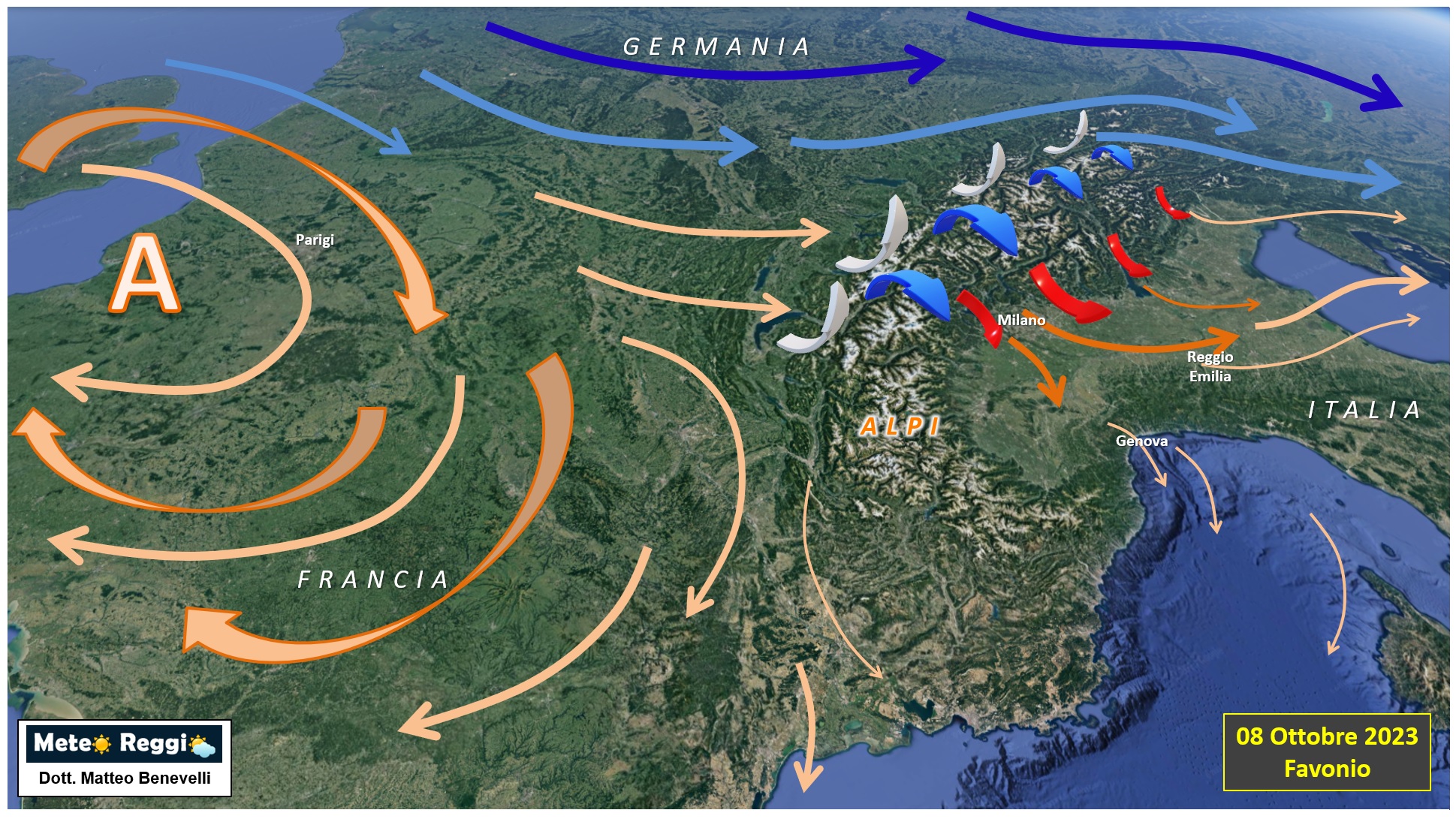 Queste correnti cadranno dalle vette alpine direttamente nel bacino padano, con un vento secco e caldo.