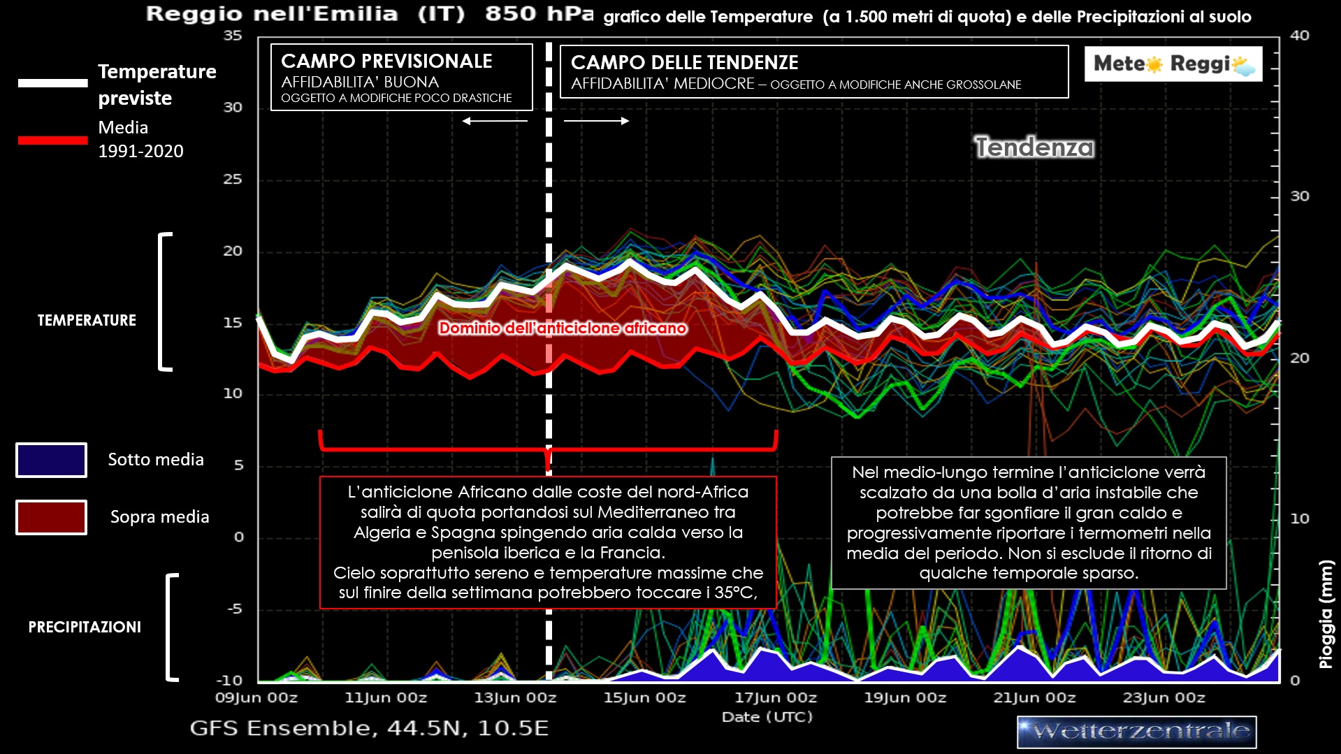Nel corso della settimana l'aria calda africana avrà modo di consolidarsi, con un massimo d’intensità previsto tra venerdì 14 e domenica 16 giugno. In questi giorni, i modelli attuali suggeriscono che le temperature massime a Reggio Emilia potrebbero toccare punte di 35°C, portando un caldo tipicamente estivo e anche un po' sopra la media del periodo.