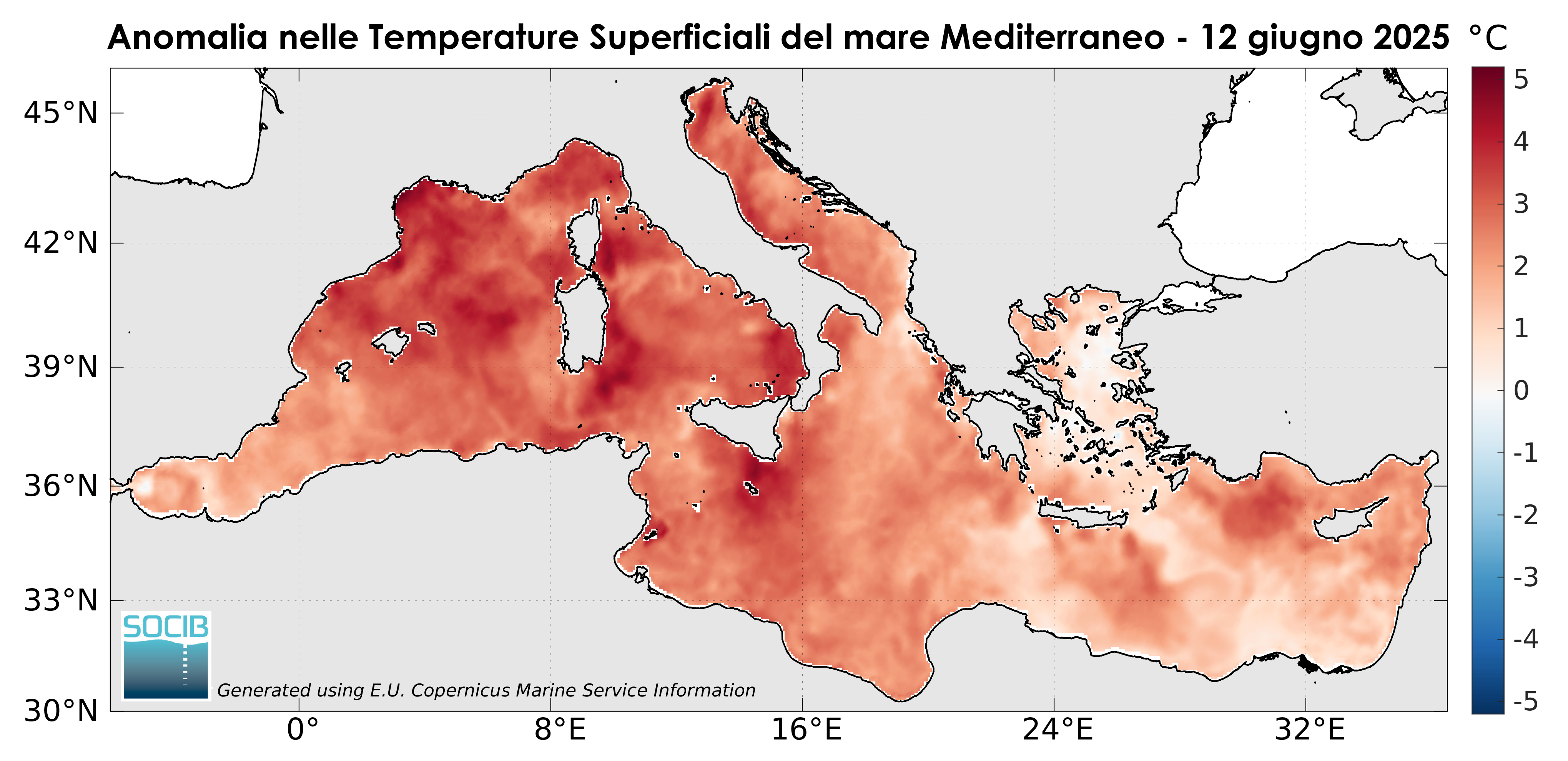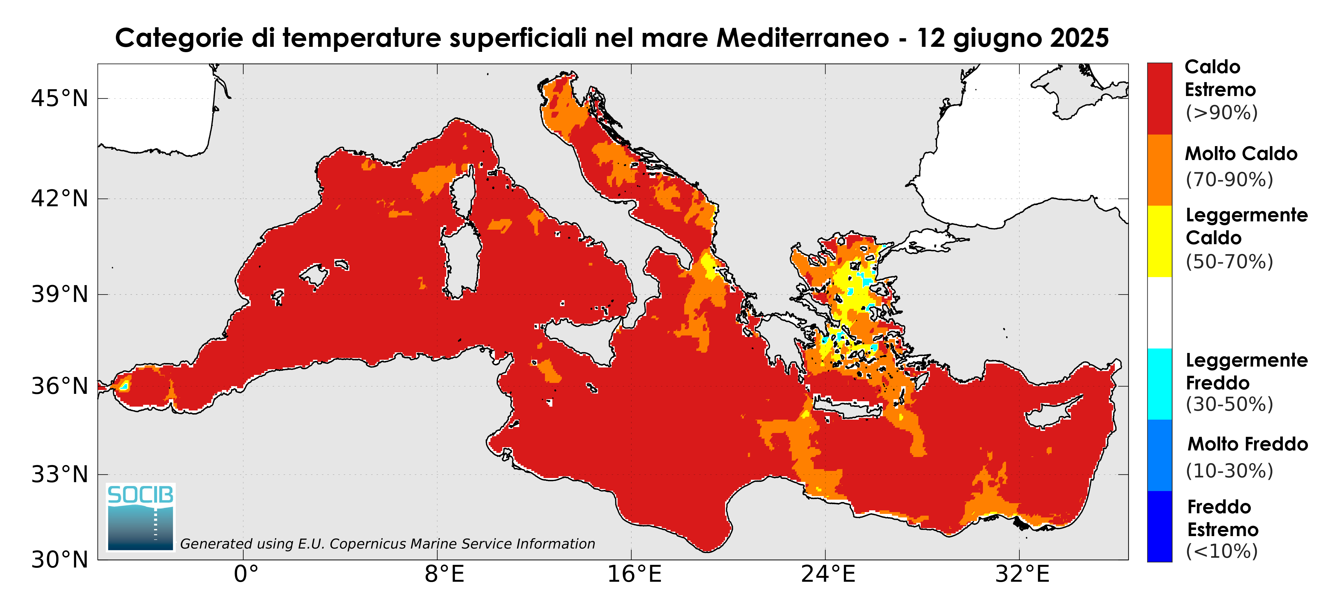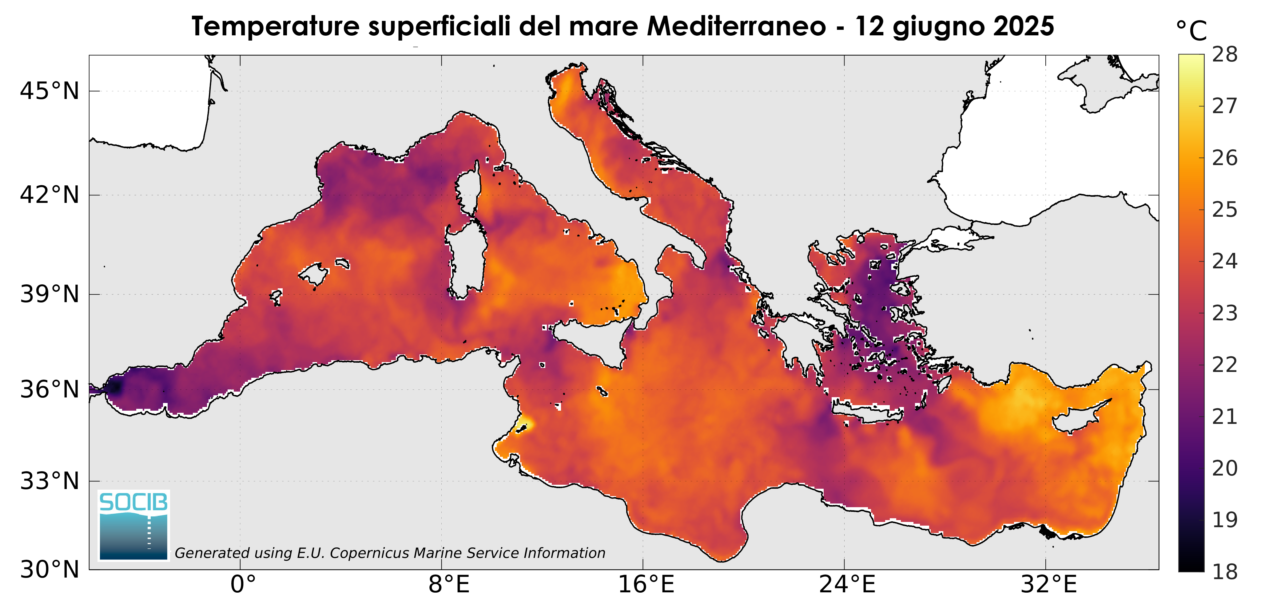 Le grafiche riguardanti le temperature superficiali del mare Mediterraneo per il 12 giugno 2025 parlano da sole, valori già molto elevati per la stagione, in diverse aree superiori ai 26-27 °C, soprattutto nei bacini occidentali e in parte del Tirreno e del Levante.