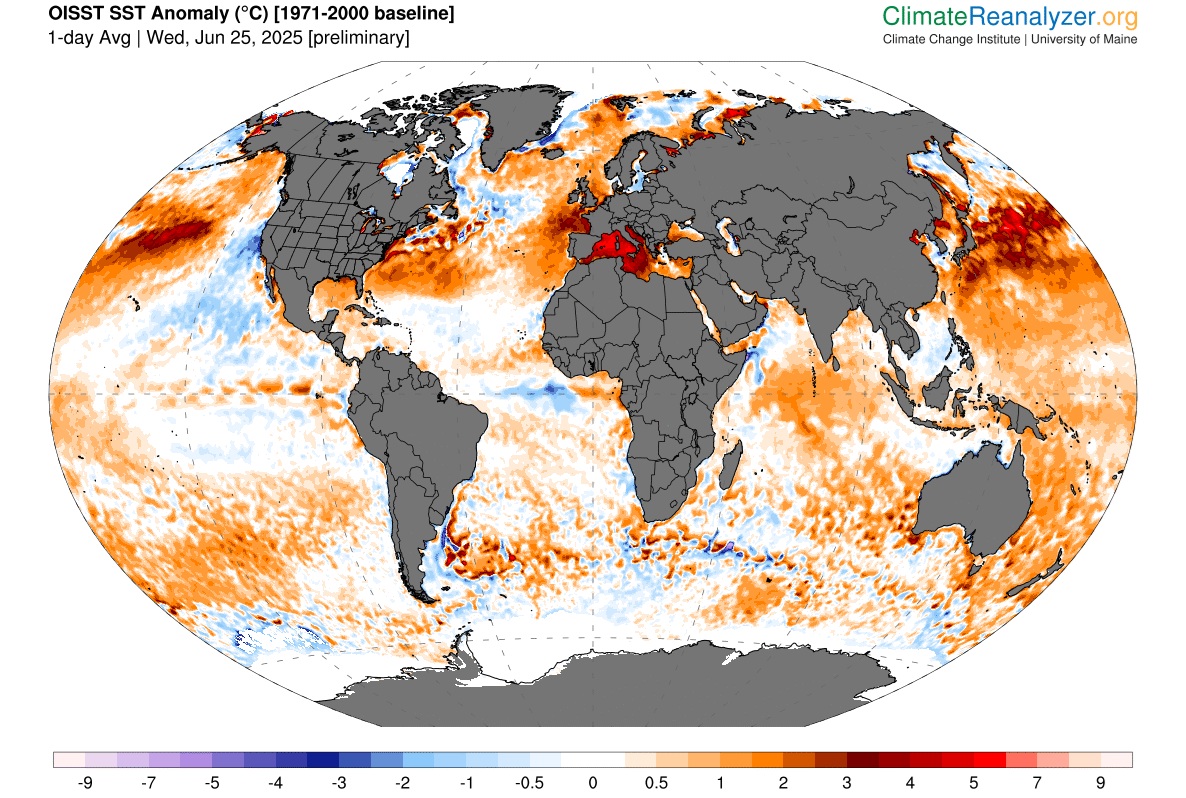 il Mar Mediterraneo è un mare semi-chiuso, con limitato scambio di acque con l’Oceano Atlantico. Questo contribuisce al rapido riscaldamento delle acque superficiali, come mostrato dalla mappa allegata, con anomalie termiche che superano ampiamente i +2°C in diverse aree del bacino.
