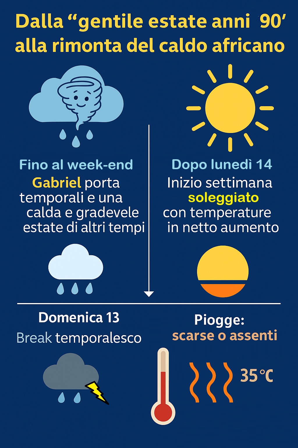 È il classico epilogo di un periodo instabile, come quelli che si verificavano spesso nelle estati degli anni '90, quando le fiammate africane erano più brevi, meno estreme, e intervallate da break temporaleschi rigeneranti.