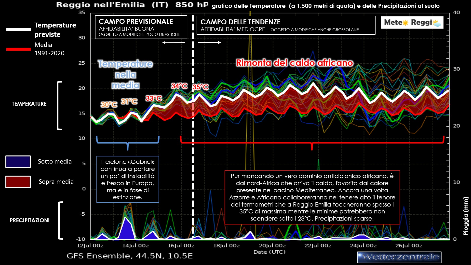Secondo le ultime elaborazioni del modello GFS (mostrate nel grafico a spaghetti), le temperature a 850 hPa (circa 1500 m di quota) saliranno ben oltre la media climatica (1991-2020), con valori medi attorno ai +23/+25°C verso il 18-20 luglio. Al suolo, ciò si tradurrà in temperature massime fino a 35°C, con minime notturne che difficilmente scenderanno sotto i 23°C, soprattutto nei centri urbani.