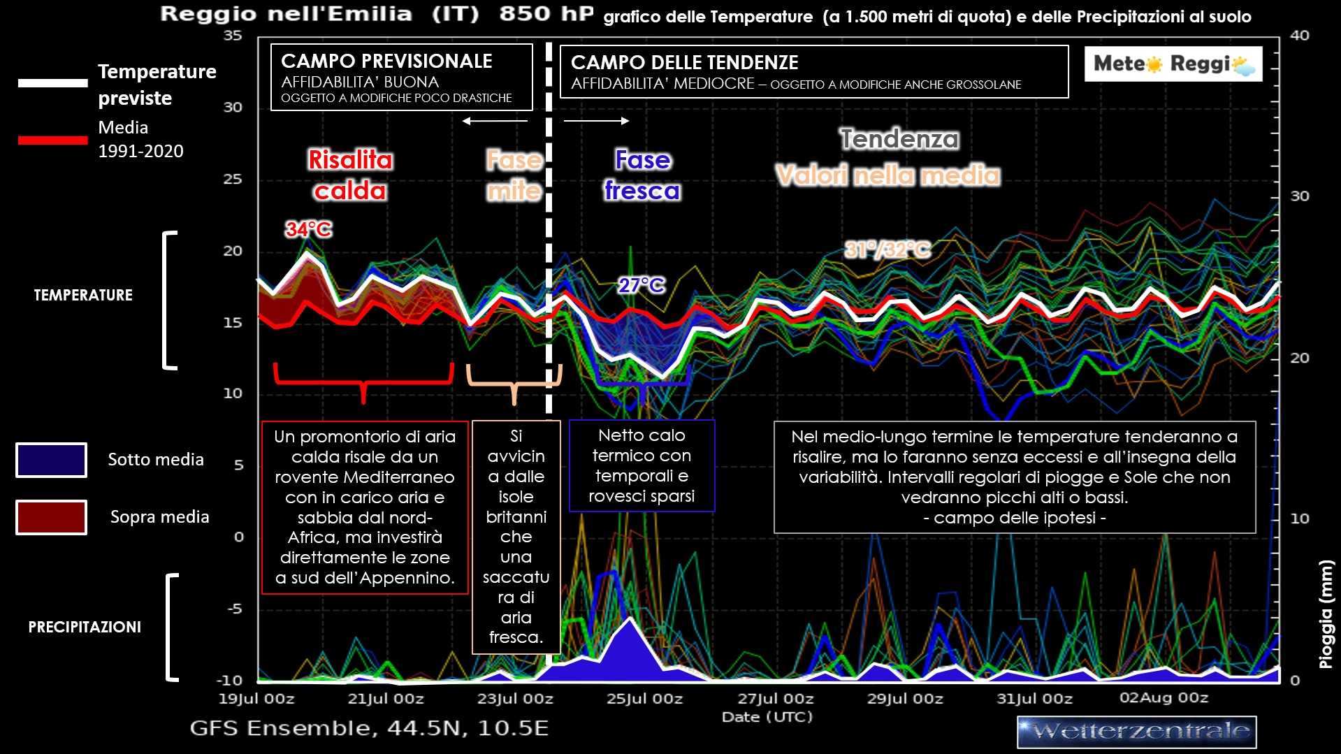 Ce lo state scrivendo da qualche giorno, negli ultimi giorni si rincorrono titoli allarmistici: “Arrivano i 50 gradi!”, “Italia nella fornace africana!”. Ma davvero dobbiamo prepararci all’inferno sulla Terra? Fortunatamente, no, e sicuramente non a Reggio Emilia e nell’area padana dove magari avremo qualche eccesso di vento caldo lunedì. Analizziamo insieme il grafico previsionale GFS "a spaghetti" aggiornato al 19 luglio, che mostra l’andamento previsto delle temperature a 1500 metri di quota (850 hPa) e delle precipitazioni al suolo per i prossimi giorni.