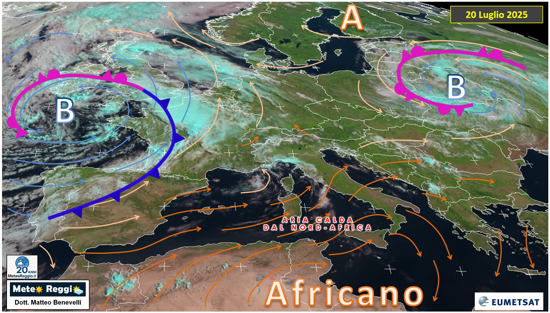 Nell’immagine satellitare del 20 luglio 2025 osserviamo una configurazione atmosferica davvero interessante: due grandi depressioni (B) a ovest e a est dell’Europa, con in mezzo un imponente campo di alta pressione (A) che staziona su gran parte del continente centrale. Questa disposizione assomiglia – con un po’ di fantasia – alla lettera greca Omega (Ω), da cui prende il nome il fenomeno: blocco Omega.