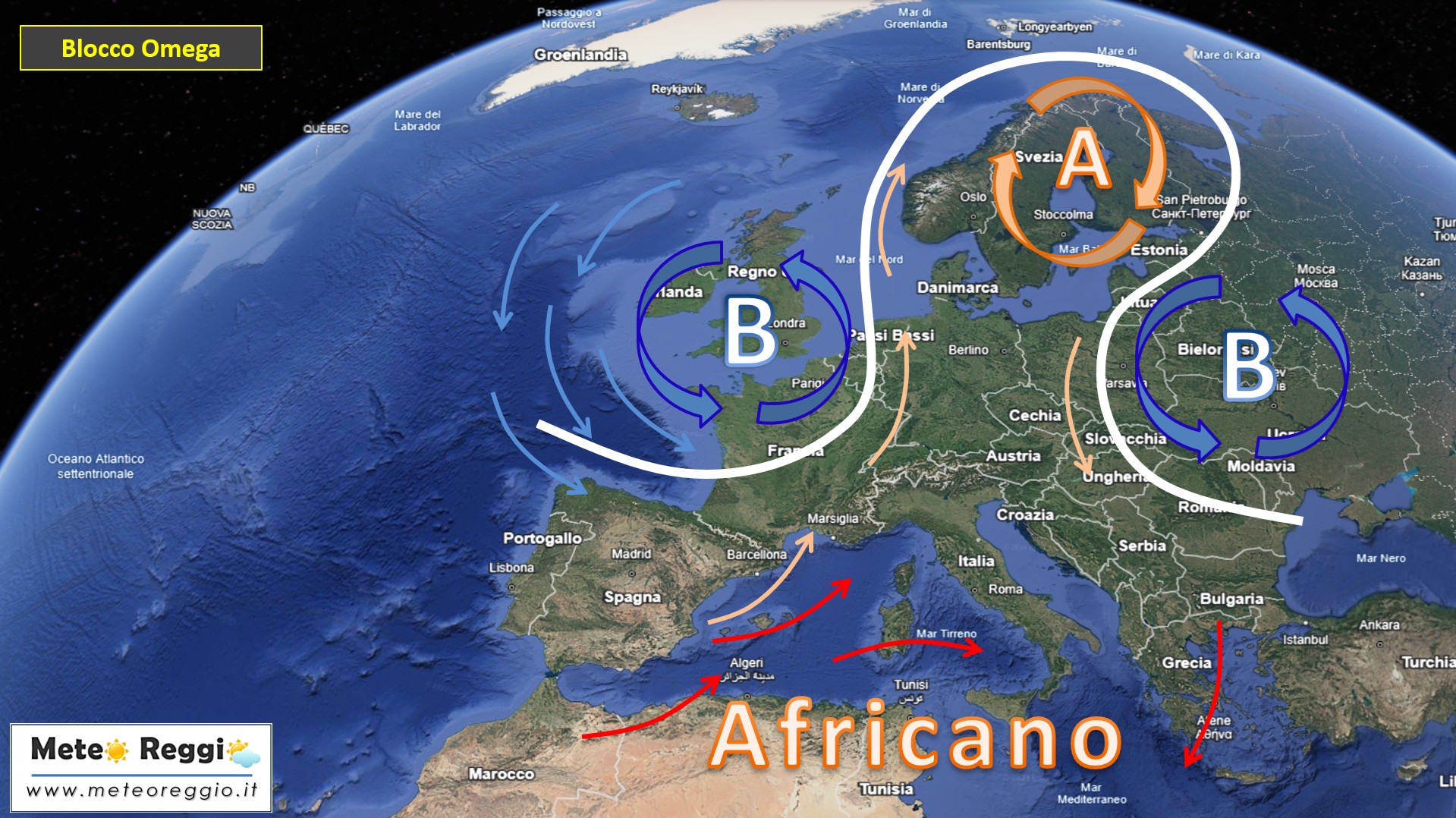 In meteorologia, si parla di blocco Omega quando l’atmosfera si organizza in una struttura simile alla lettera Ω: