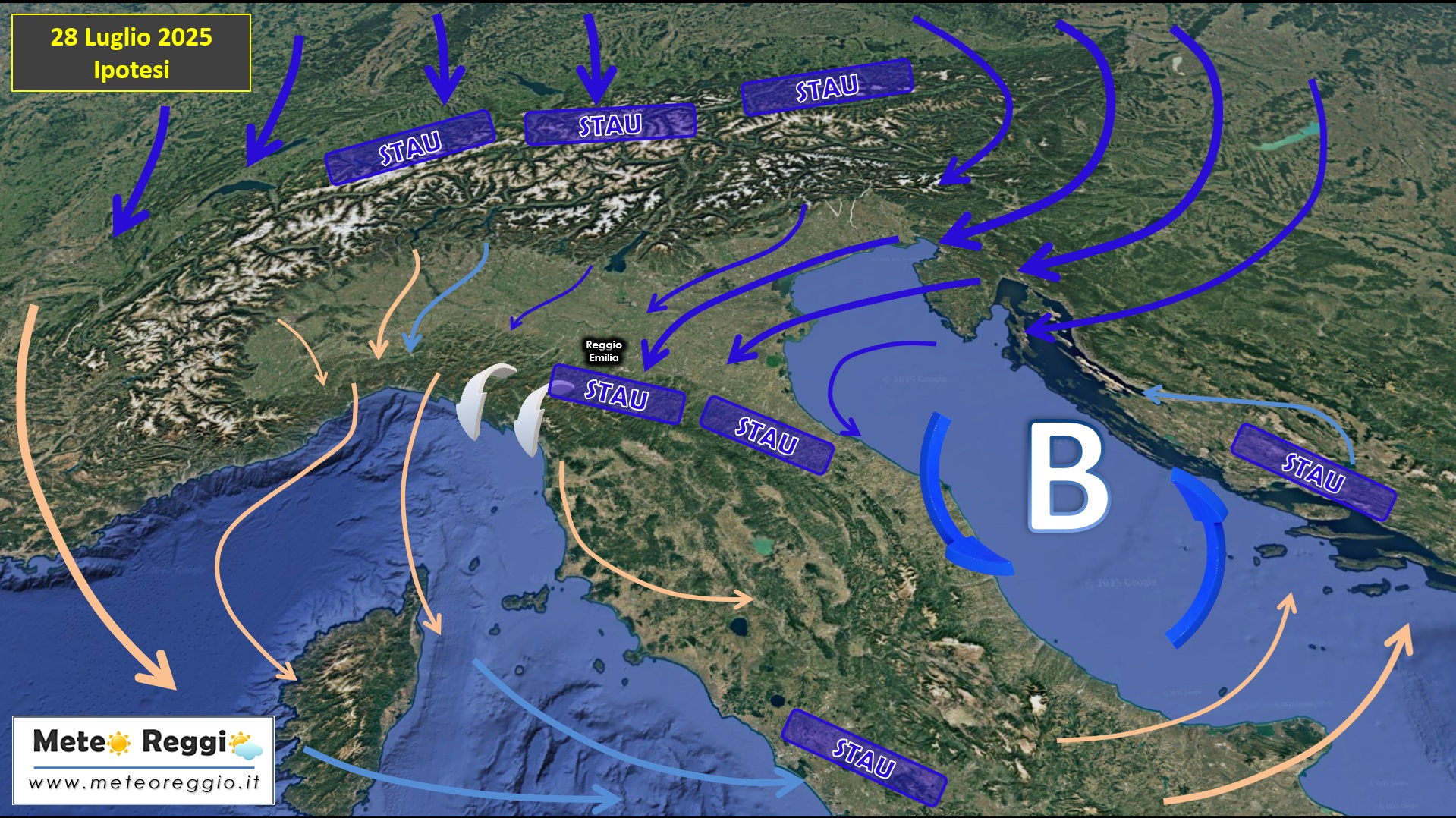 Lo scenario meteorologico per la giornata di lunedì 28 luglio 2025 sull'Italia, e in particolare sull'Emilia-Romagna, si prospetta decisamente diverso rispetto alle precedenti, allarmistiche previsioni di caldo estremo in cui si sbandieravano i 50°C per attirare l'attenzione. Questa volta è confermato un sensibile calo delle temperature, che non è dovuto all'arrivo del freddo, ma al rientro nella norma di valori precedentemente eccezionali per il periodo estivo se ragioniamo come Italia e non come Reggio Emilia. Ma nel locale, oggi, si parla molto di ciò che potrebbe accadere tra domenica 27 e lunedì 28 poiché si teme molta pioggia e un discreto evento di stau. Ma perché se ne parla? Cosa vedono i modelli previsionali? I timori sono legati alla possibile formazione di una bassa pressione nell'Adriatico piuttosto coriacea, ma andiamo per gradi ...
