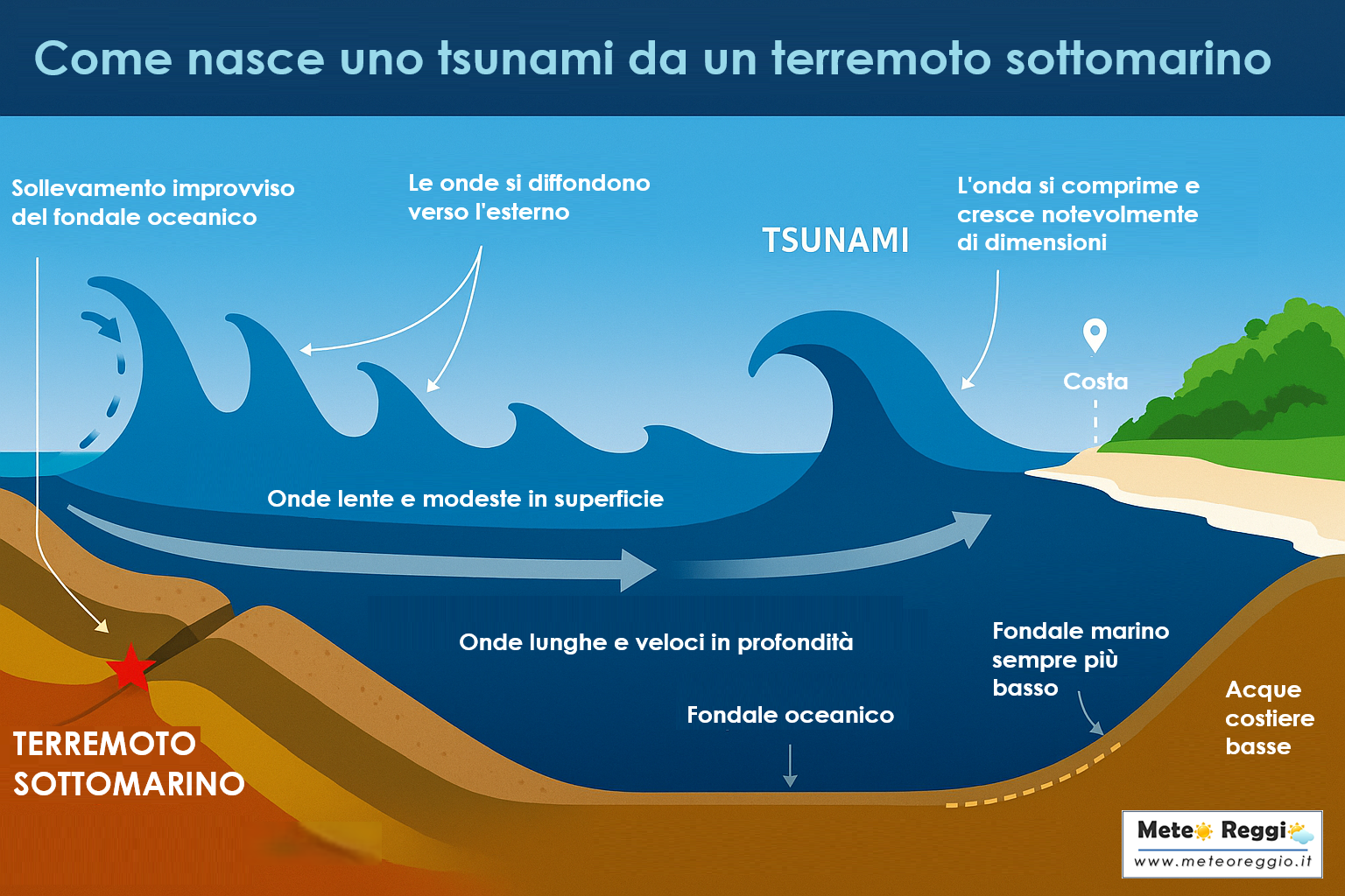 In mare aperto queste onde sono quasi invisibili, con altezze di pochi decimetri. Ma quando si avvicinano alla costa, il fondale diventa più basso e le onde rallentano, si comprimono e crescono in altezza. È qui che possono trasformarsi in muri d’acqua alti metri, devastanti per tutto ciò che incontrano.