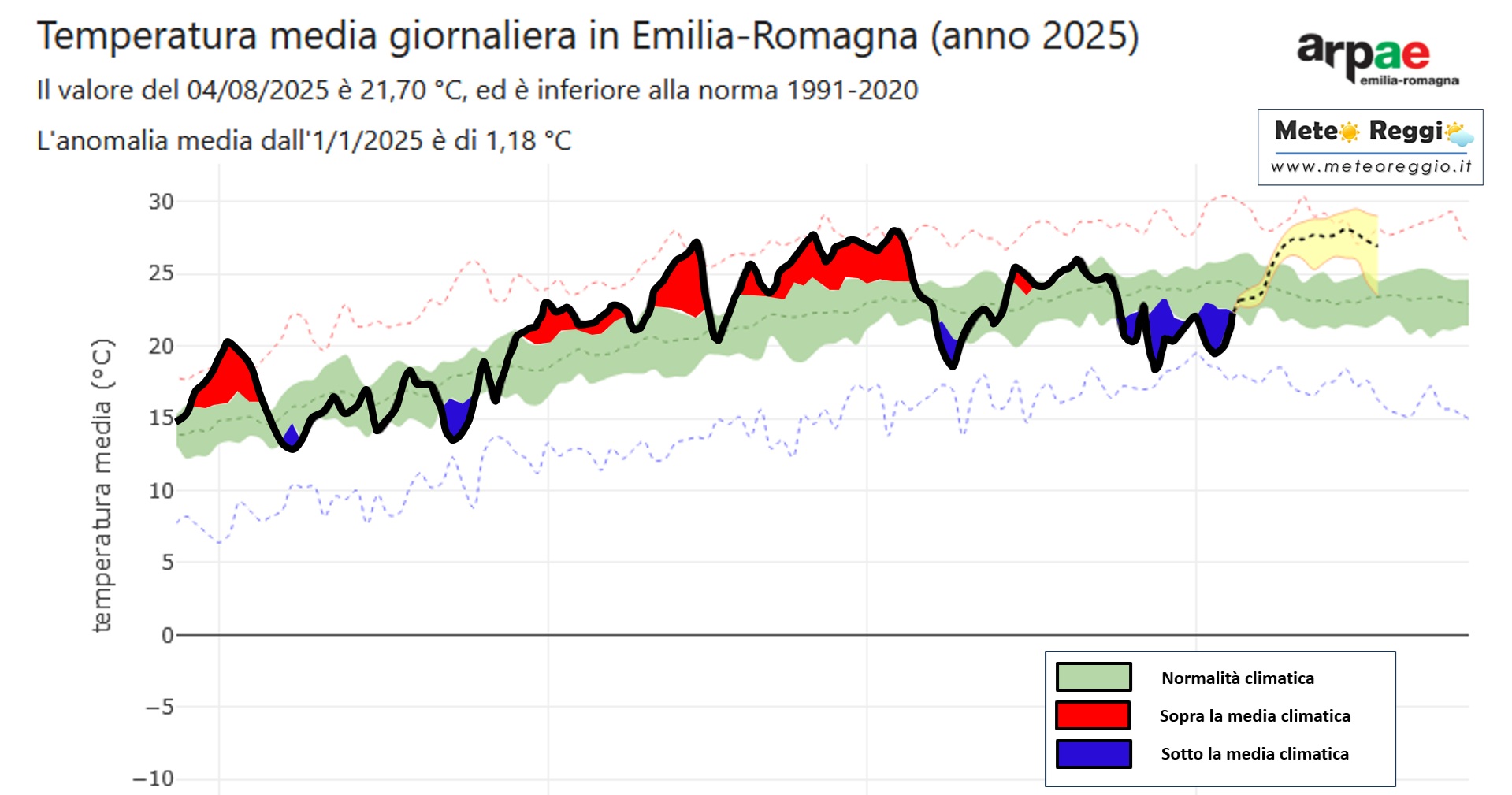 -> Solo a partire da fine luglio e nei primi giorni di agosto si è osservata una fase sotto media (evidenziata in blu), che ha riportato le temperature a valori più consoni alla stagione, o addirittura leggermente più freschi.