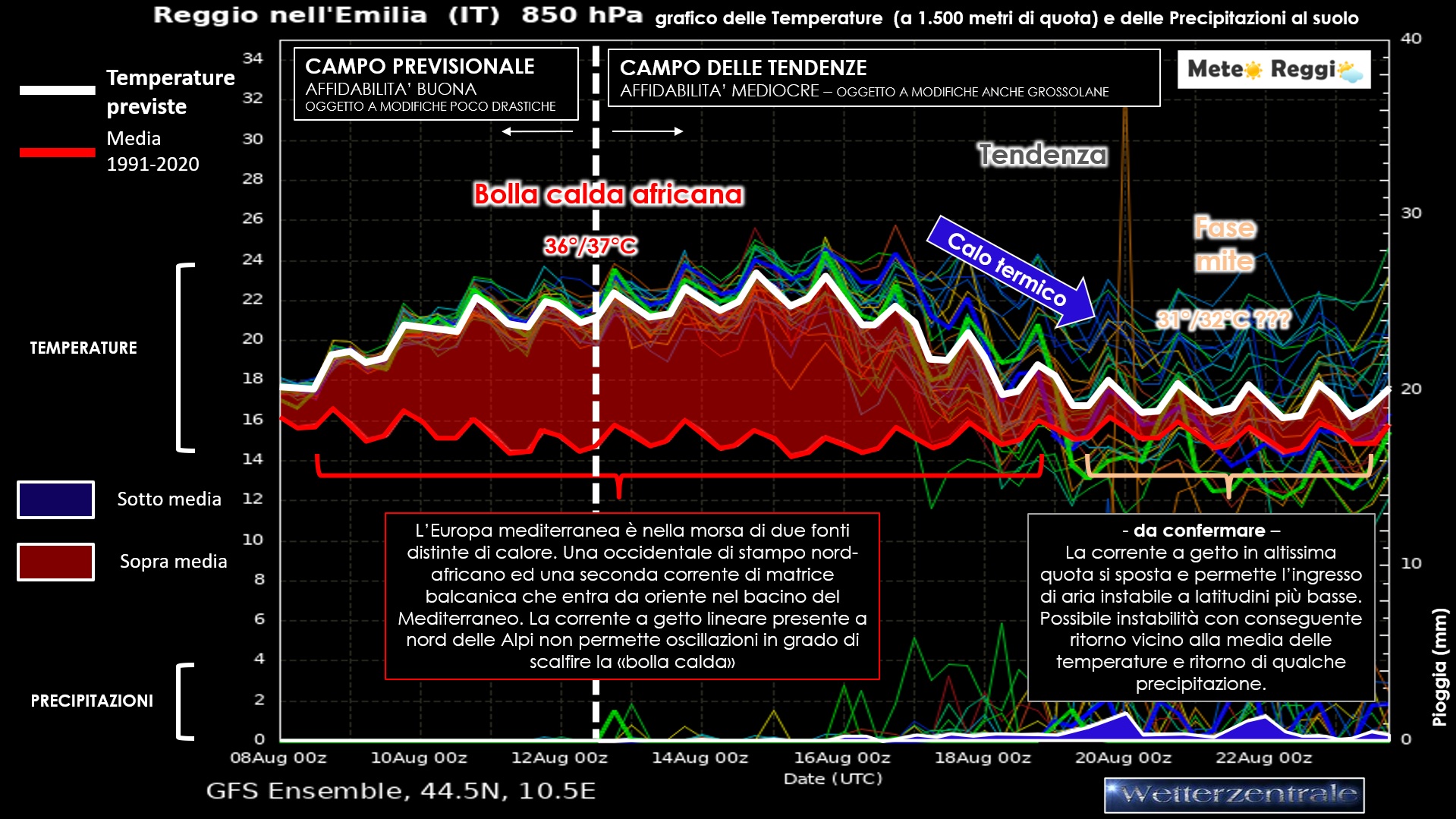 Il grafico “a spaghetti” allegato, che mostra le temperature a 1.500 metri (850 hPa) e le precipitazioni previste, conferma l’anomalia... proviamo a leggerla insieme:
