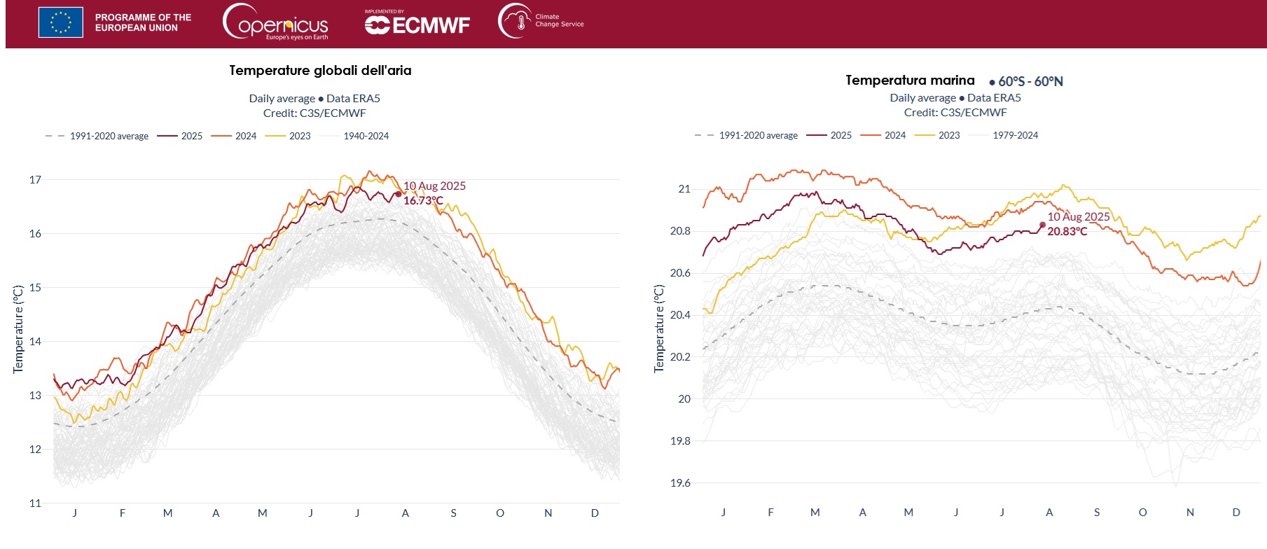 I dati elaborati dal Copernicus Climate Change Service (ECMWF) mostrano come, al 10 agosto 2025, le temperature globali dell’aria e della superficie marina si mantengano tra le più alte mai registrate, pur segnando valori leggermente inferiori rispetto ai picchi eccezionali del 2023 e del 2024.