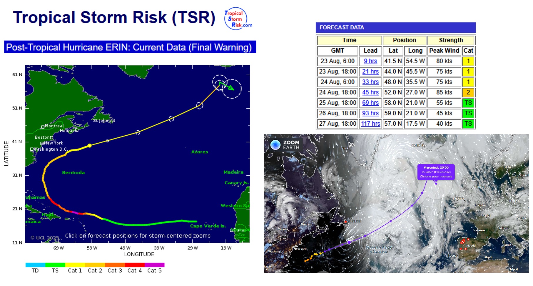 Successivamente, il sistema ha curvato verso nord-est, attraversando le acque più fresche dell’Atlantico settentrionale. Questo è un punto chiave: gli uragani si alimentano con il calore dell’oceano, e spostandosi verso latitudini più alte perdono rapidamente forza, trasformandosi in cicloni post-tropicali.