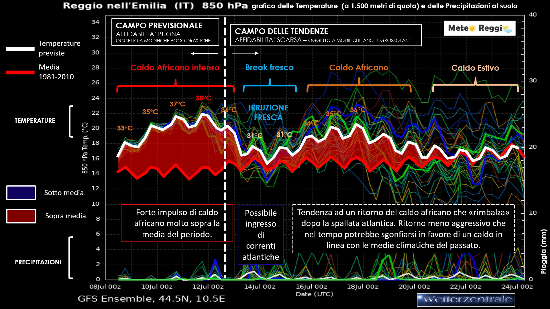 Questo fine settimana sarà caldo ma non estremamente eccessivo, gli eccessi li toccheremo da Lunedì in poi con punte che minacciano di arrivare a raggiungere i 38°C in Città mercoledì 12 luglio. Questa giornata dovrebbe essere il culmine dell'onda di calore africana, perché secondo i nuovi modelli un vortice di bassa pressione che stazionava da giorni sulle isole britanniche si rimetterà in moto sbloccandosi da una stasi che la metteva in relazione con una seconda bassa pressione ad est che limitava l'anticiclone Africano (blocco a omega).