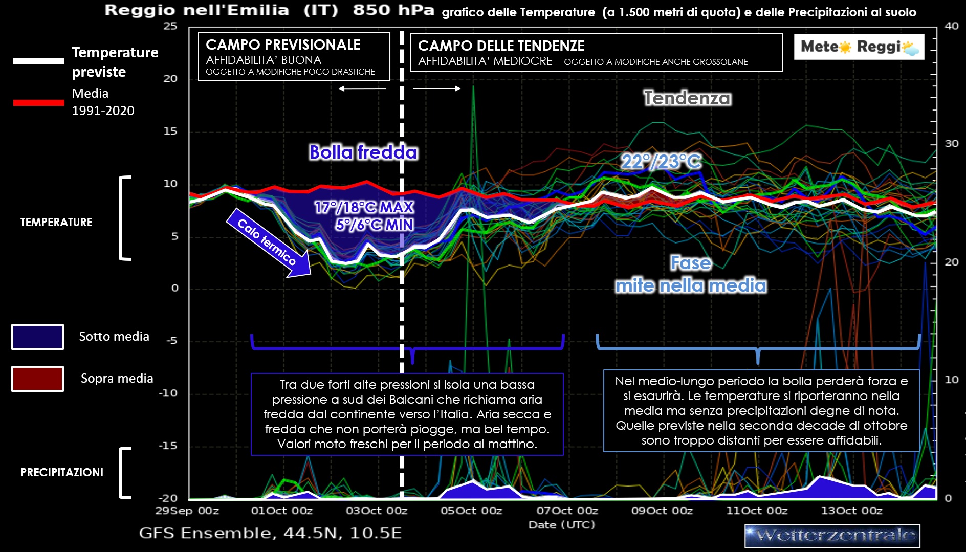 Per Reggio Emilia, si prevedono massime di circa 17°/18°C e minime tra 5°/6°C. Nelle campagne della Pianura, i valori notturni potrebbero essere persino inferiori. Si tratta di temperature nettamente sotto la media climatologica del periodo, come evidenziato dalle linee rosse e blu del grafico che, a partire dal 1∘ ottobre, si portano stabilmente nella fascia "Sotto media" (blu scuro).