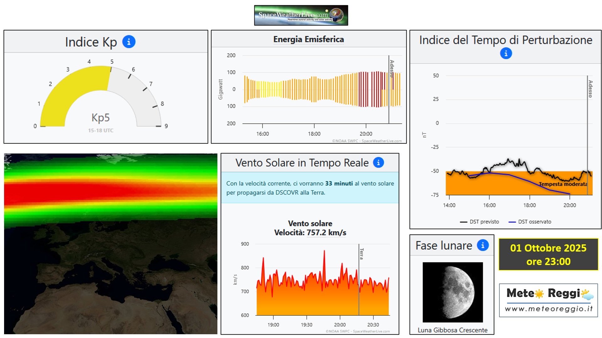Un'intensa attività solare ha colpito il campo magnetico terrestre, scatenando una tempesta geomagnetica che ha portato l'indice planetario Kp a quota 5 nella fascia oraria tra le 15:00 e le 18:00 UTC (ora di Greenwich), e che si mantiene su valori significativi anche in serata. I dati in tempo reale mostrano un vento solare con una velocità elevata, intorno a 757 km/s, e un livello di perturbazione che, pur in moderata tempesta, ha già permesso di osservare bagliori rossi dell'aurora boreale spingersi fino alle latitudini delle Alpi italiane.