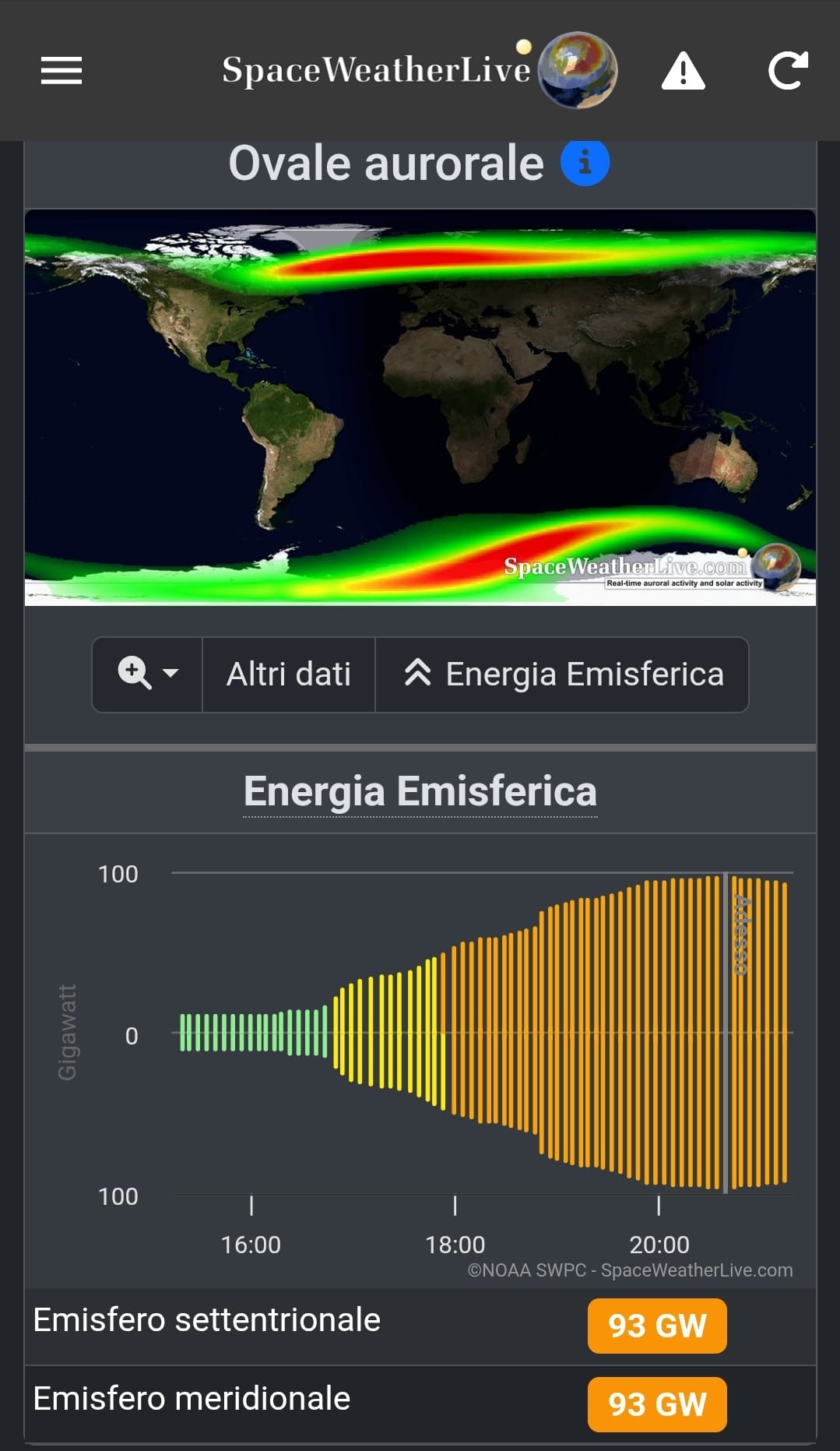 -> Rosso: Il colore rosso, che hai osservato, è provocato dall'interazione delle particelle solari con l'ossigeno molecolare e si verifica ad altitudini maggiori, tra i 400 e gli 800 km. Il fatto che il rosso sia visibile a latitudini come le Alpi, mentre la componente verde è spesso al di sotto dell'orizzonte o assente, è un chiaro segno di una tempesta geomagnetica molto intensa.