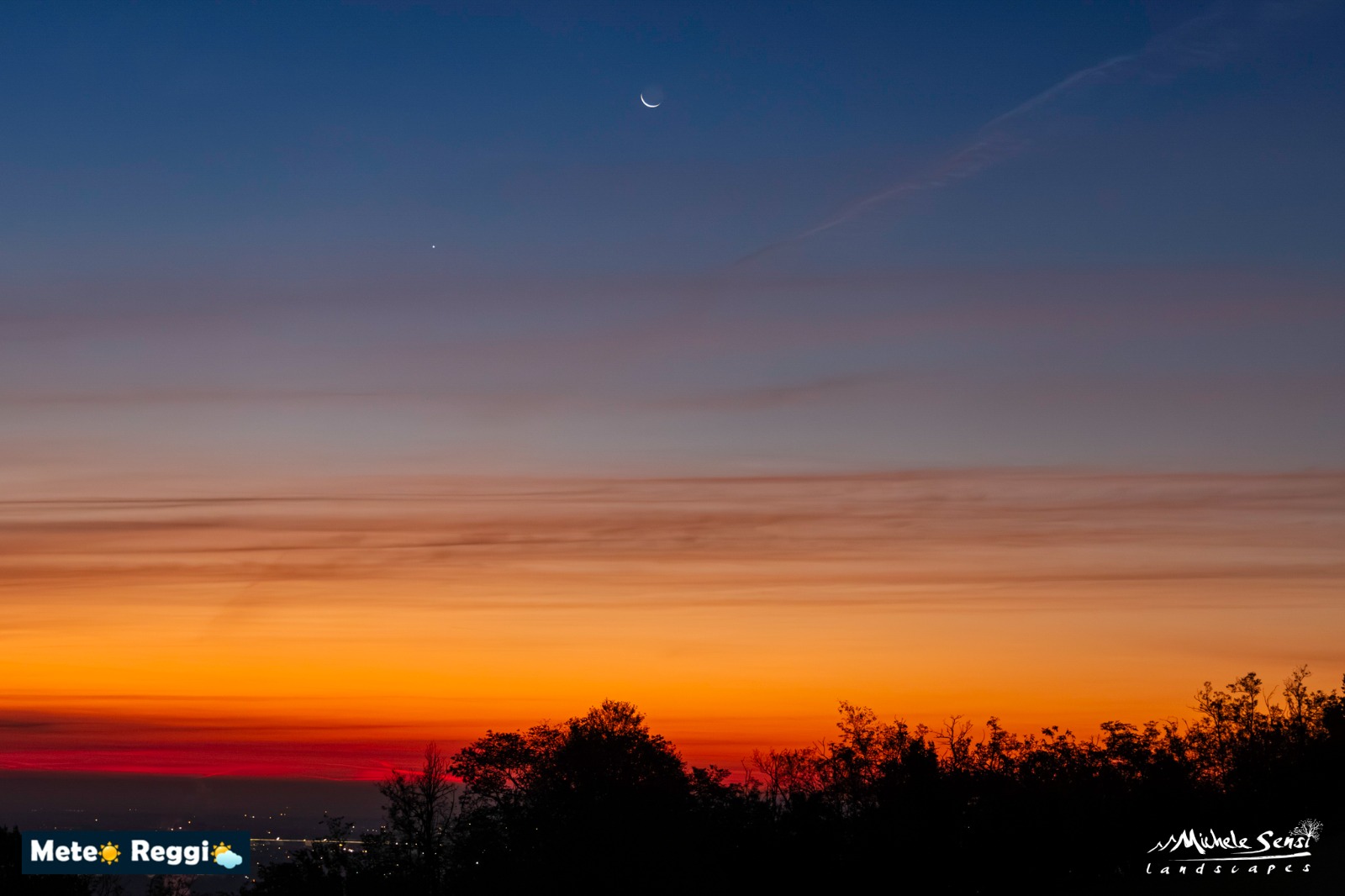Oltre al magnifico scenario terrestre e atmosferico, la foto cattura un momento astronomico speciale: una suggestiva congiunzione tra il pianeta Venere e una Luna Calante.