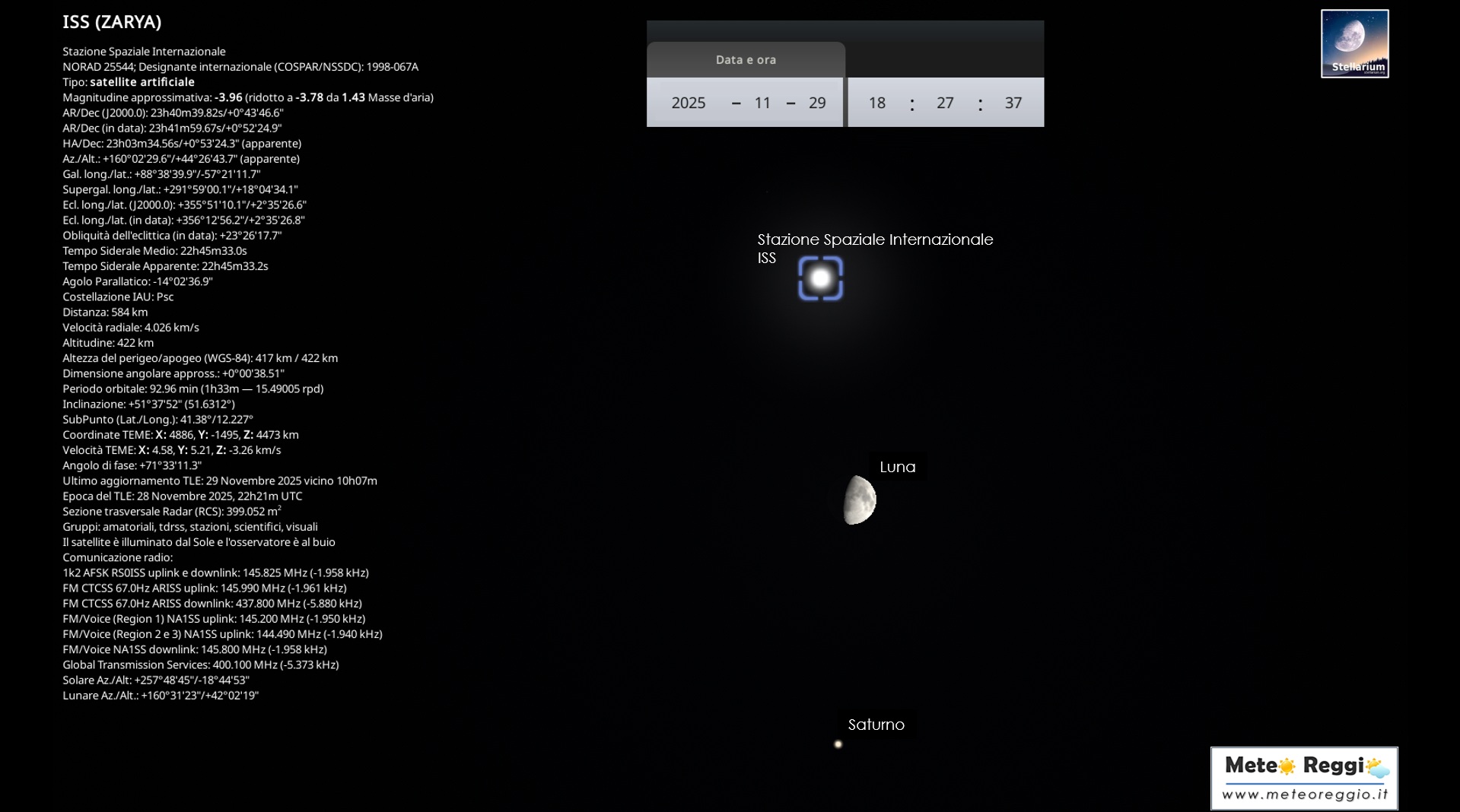 Questa sera avremo uno spettacolo astronomico davvero particolare sopra la provincia di Reggio Emilia. Il cielo si preannuncia sereno e trasparente, condizione perfetta per osservare un triplo incontro tra Stazione Spaziale Internazionale (ISS), Luna e Saturno. Un evento che unirà osservazione astronomica e attività spaziale umana a oltre 400 km di altezza.