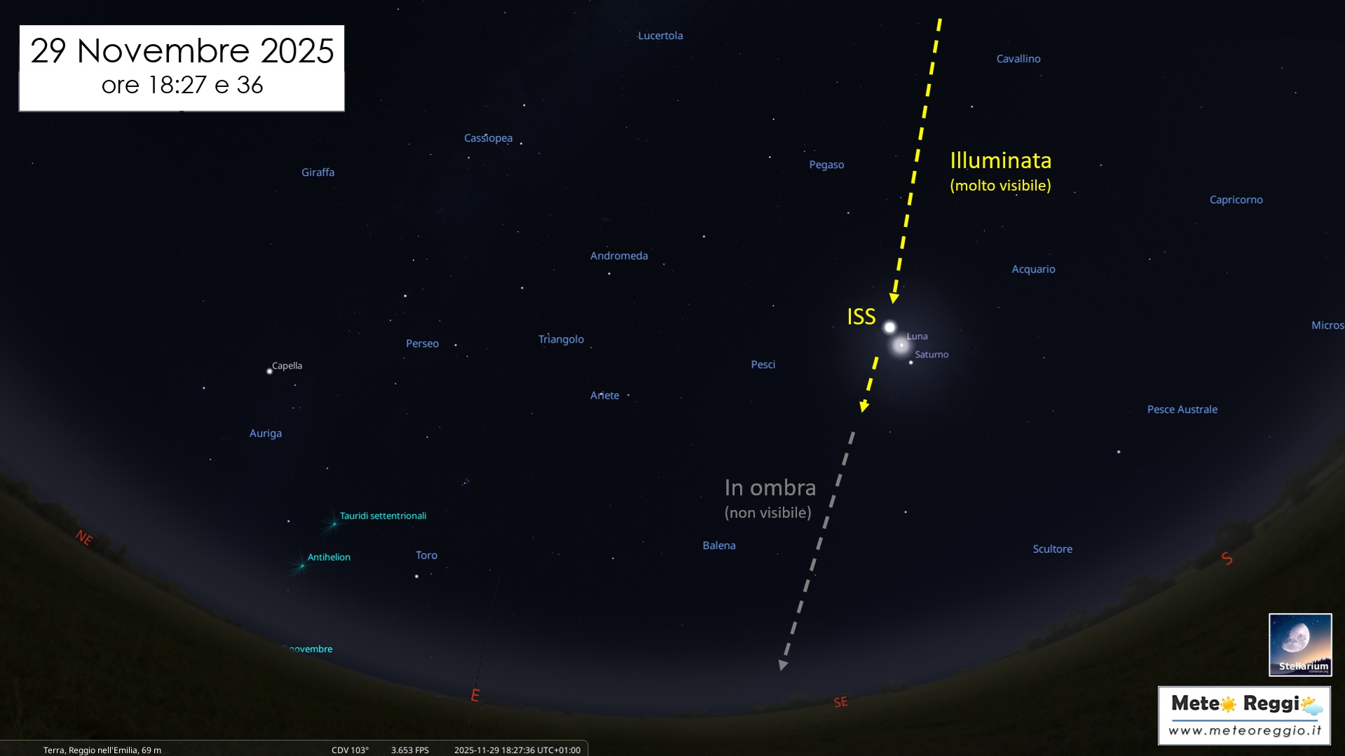 Occhi a sud-est per vedere questo quadro che unisce le meraviglie naturali del cielo con il simbolo più concreto dell’esplorazione umana. L'occasione per riflettere anche sulle "distanze astonomiche" che separano questi 3 oggetti nel cielo: 1 miliardo e 375 milioni di chilometri ci separano dal "Signore degli Anelli", 370 mila chilometri ci separeranno dalla Luna, mentre la Stazione Spaziale si troverà a "soltanto" 665 km da Reggio Emilia.