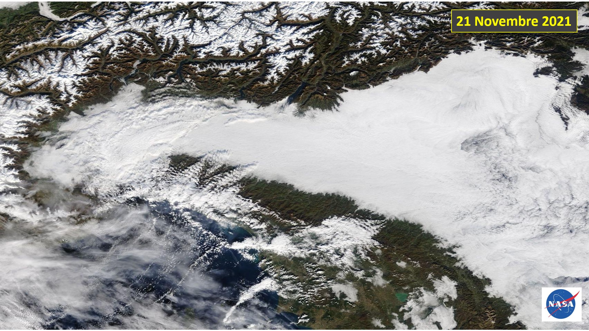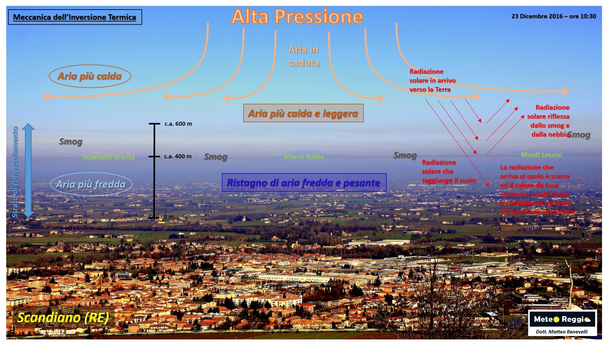 La Pianura Padana, chiusa dalle Alpi e dagli Appennini, è come una grande bacinella: quando l’atmosfera è stabile, soprattutto sotto un’alta pressione, l’aria fredda e pesante ristagna sul fondo della pianura, mentre l’aria più calda rimane sopra, creando una sorta di “coperchio”.