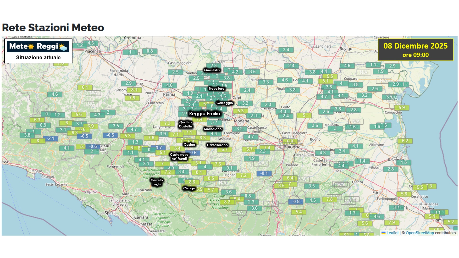 Può capitare, nelle situazioni più marcate, che a Baiso o a Viano ci siano 10–12 °C mentre in pianura, a Reggio o a Scandiano, si resti vicini allo zero con nebbia fitta.