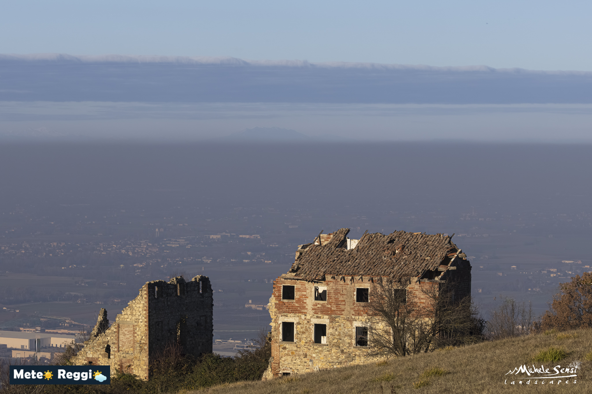-> Sotto, la pianura quasi nascosta, immersa in uno strato stagnante che limita visibilità e qualità dell’aria.