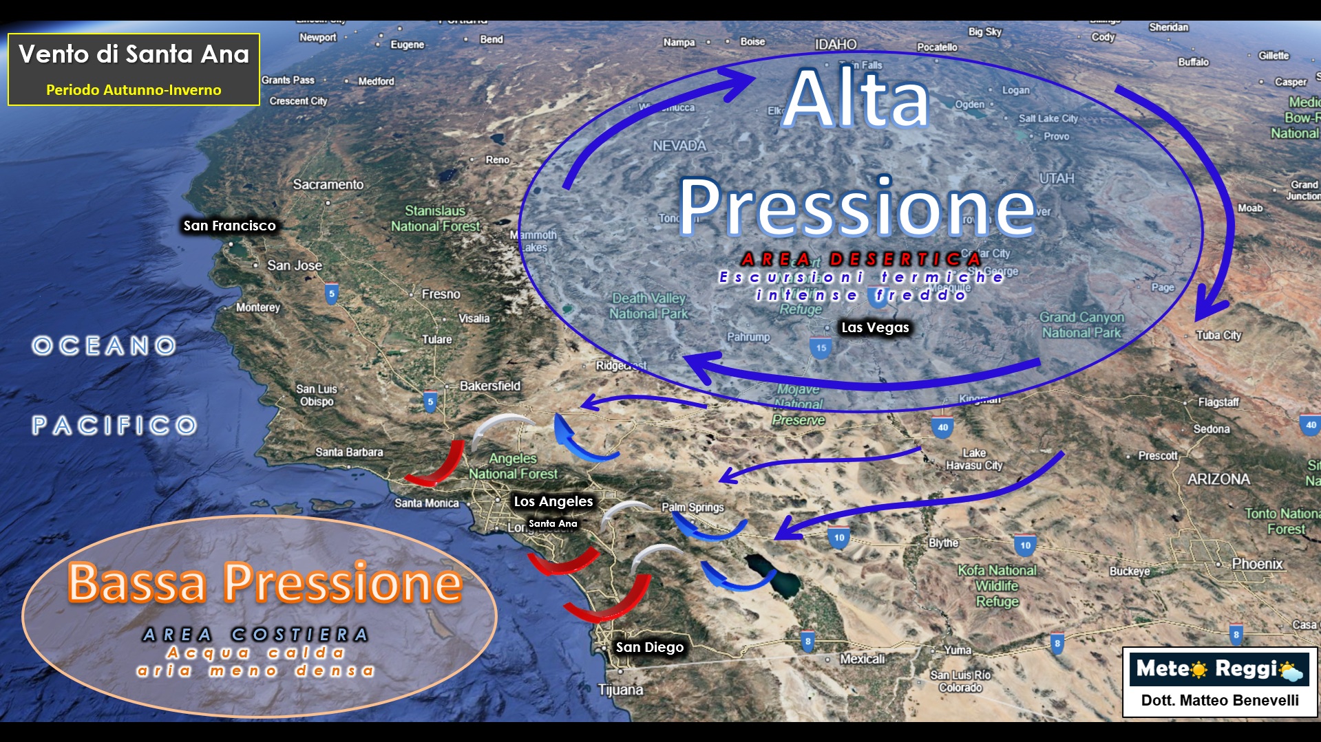I Santa Ana sono venti caldi, secchi e molto intensi che soffiano dai deserti interni verso la costa, soprattutto tra l’autunno e l’inverno. Nascono quando masse d’aria fredda e densa si accumulano sugli altopiani interni del Mojave e del Great Basin. Spingendosi verso ovest, l’aria scende lungo i versanti montuosi e, a causa della compressione, si riscalda e si dissecca. Questo processo è ben noto nella meteorologia e prende il nome di riscaldamento adiabatico.