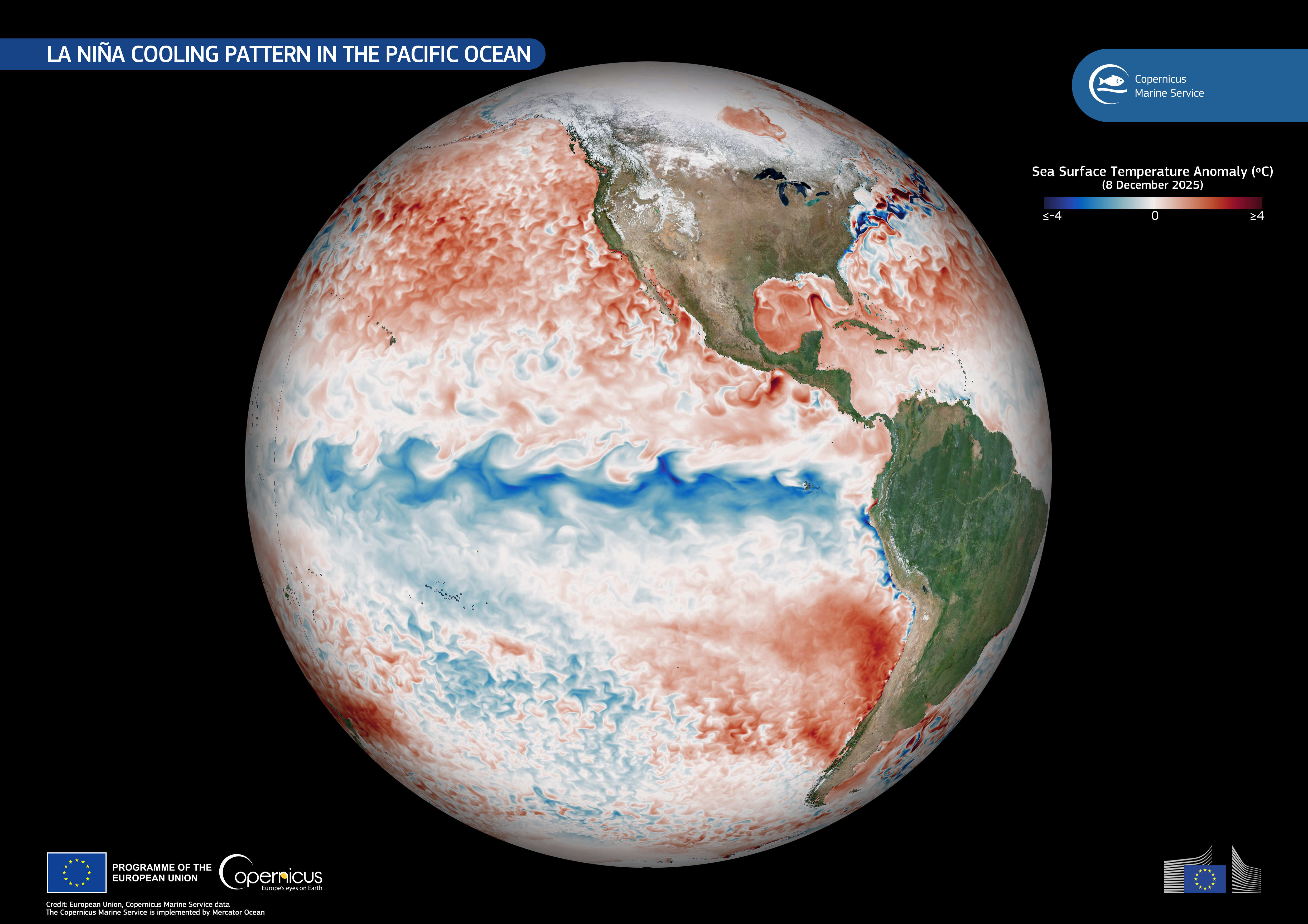 L'ultima mappa rilasciata dal servizio europeo Copernicus Marine Service (che vedete in alto) parla chiaro: una vistosa lingua blu attraversa l'Oceano Pacifico centrale e orientale lungo l'equatore. Quella "striscia" non è solo un cambio di colore grafico, ma il segnale inequivocabile del ritorno de La Niña.