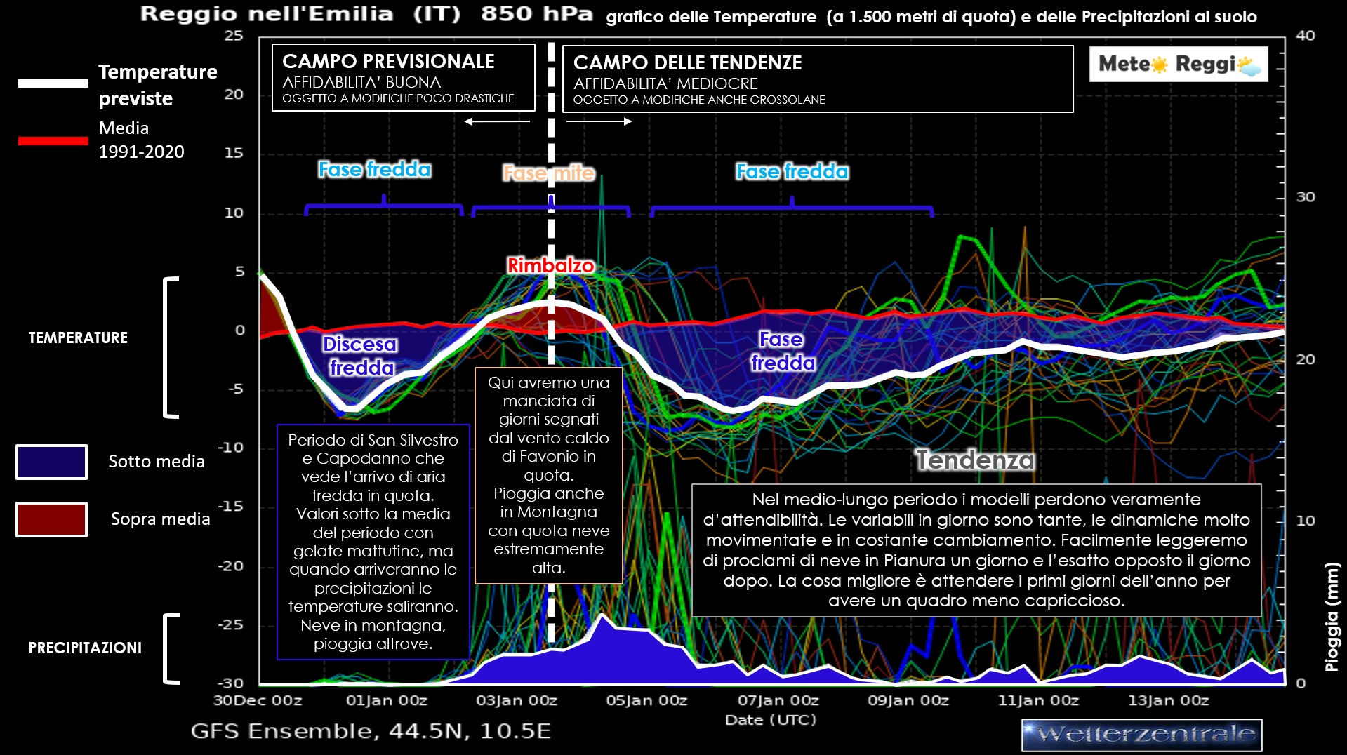REGGIO EMILIA – Siamo agli sgoccioli di un 2025 che si congeda con un classico copione invernale per la nostra provincia: l’anticiclone, un po' di nebbia gelida in Pianura e cieli tersi in Appennino. Ma cosa ci aspetta davvero per i primi giorni del nuovo anno? Mentre sul web iniziano a rincorrersi titoli sensazionalistici che annunciano "ere glaciali" o "caldi record", la realtà dei dati — analizzata attraverso il grafico GFS Ensemble (gli "spaghetti") — ci racconta una storia fatta di incertezza e bruschi cambiamenti ...