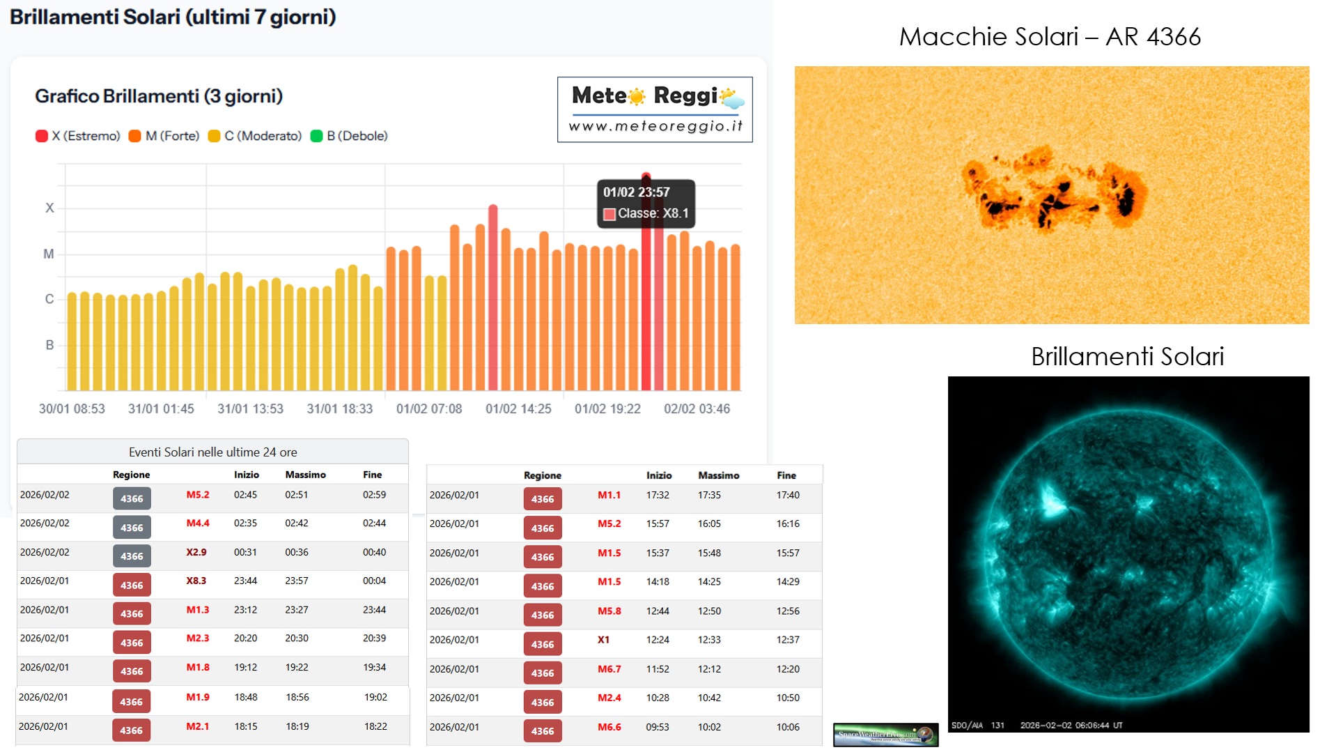 Il picco è stato raggiunto questa notte, alle ore 23:44 UTC (00:44 italiane), quando un brillamento ha toccato l'incredibile valore di X 8.3. Per dare un'idea della scala, i brillamenti di classe X sono i più grandi eventi esplosivi del sistema solare e possono rilasciare l'energia equivalente a miliardi di bombe all'idrogeno.