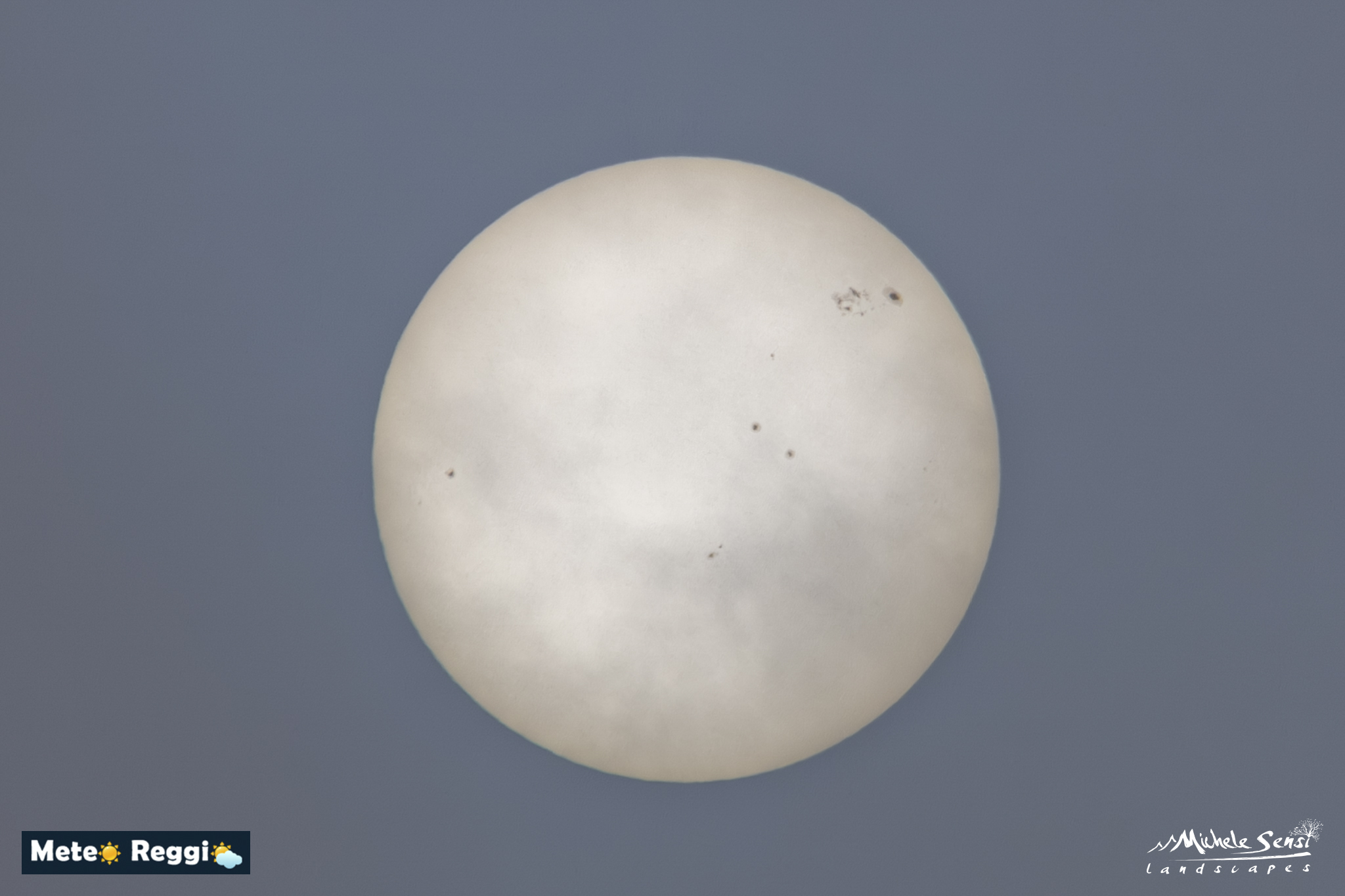 Questa bellissima fotografia di Michele cattura il Sole in un momento di apparente quiete, ma la realtà è ben diversa. Grazie al filtro naturale della nebbia reggiana, che ha agito come un oscurante perfetto, possiamo osservare a occhio nudo (ma sempre con la protezione della fotocamera!) la complessa architettura della stella, dominata dalla regione AR 4366. Regione estremamente attiva che non ha prodotto eventi tangibili, ma che è stata per diversi giorni ben orientata verso la Terra.