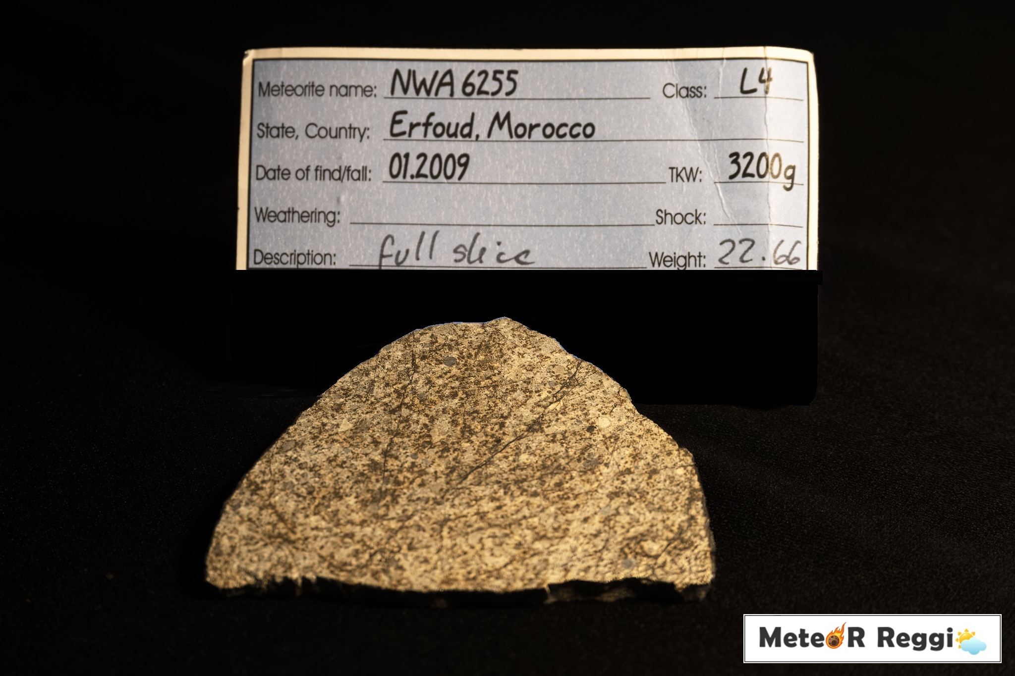 Rinvenuta nel gennaio del 2009 nei pressi di Erfoud, una celebre località nel deserto del Sahara marocchino nota per i suoi giacimenti fossili, la NWA 6255 (Northwest Africa 6255) è una testimonianza fossile della formazione dei pianeti. Con una massa totale recuperata (TKW) di soli 3200 grammi, ogni frammento è un prezioso tassello scientifico.