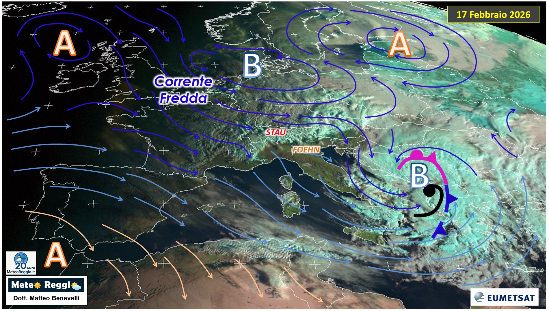 L’immagine satellitare di oggi, 17 febbraio 2026, parla chiaro: un’imponente discesa di aria artica dalle Isole Britanniche si è schiantata frontalmente contro la barriera delle Alpi.