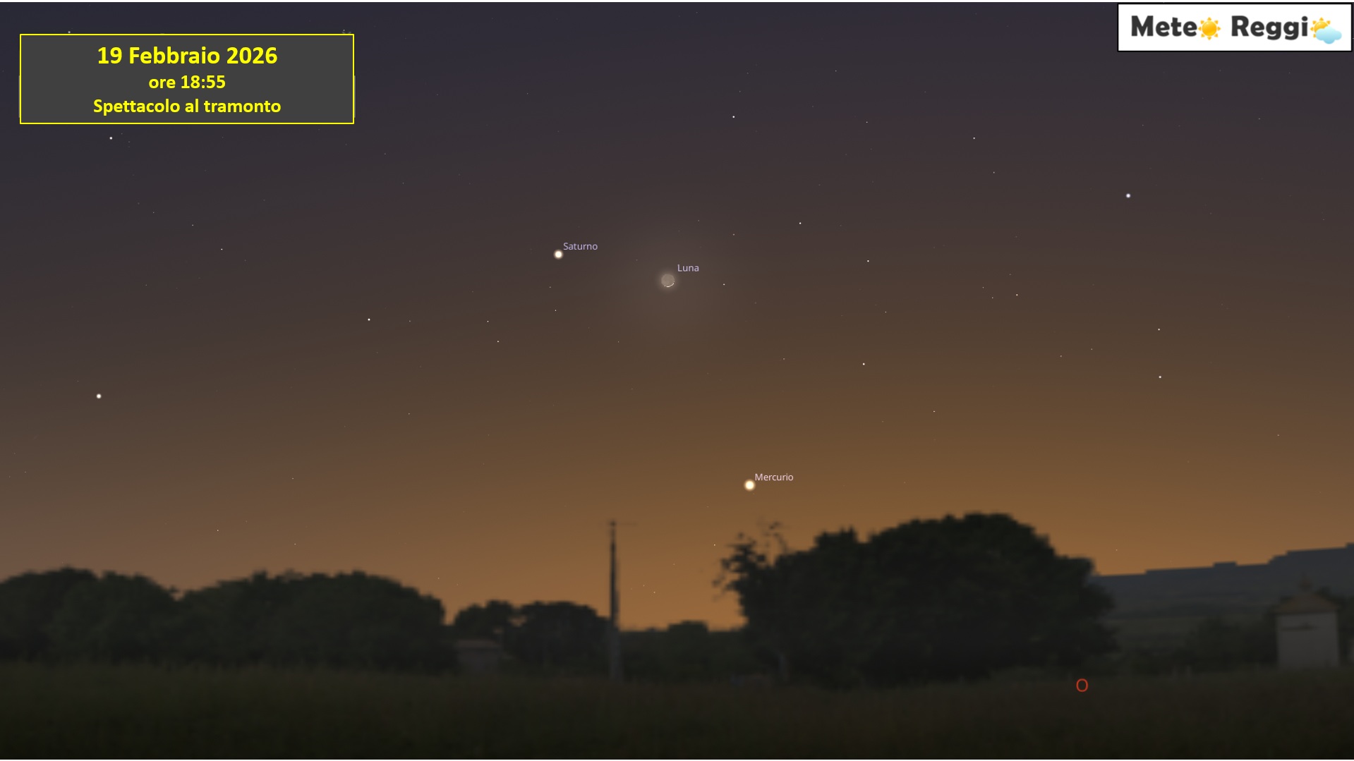 In queste sere di febbraio, se le nuvole cariche di pioggia concederanno una tregua e puliranno l'orizzonte, potremo alzare gli occhi verso Ovest per ammirare un quadretto celeste di rara eleganza. Subito dopo il calo del Sole, mentre la luce del crepuscolo sfuma nell'arancio, i protagonisti della scena sono tre: un sottilissimo falcetto di Luna crescente, il misterioso Mercurio e il "signore degli anelli", Saturno.