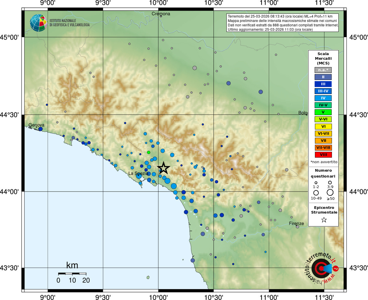 REGGIO EMILIA – Una mattinata movimentata per molti cittadini della nostra provincia. Alle ore 08:13 di oggi, mercoledì 25 marzo 2026, la rete di monitoraggio sismico ha registrato una scossa di magnitudo 4.0 con epicentro localizzato a circa 3 km a Nord-Est di Fosdinovo (MS), a una profondità (ipocentro) di 10.9 km.