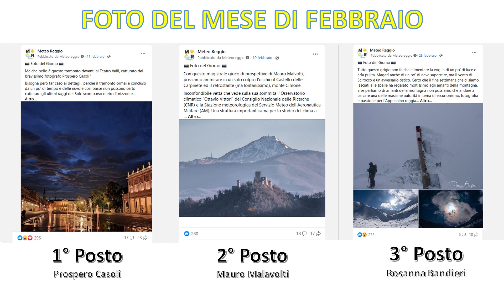 Ed eccoci a congratularci con Prospero Casoli che ci ha presentato un suggestivo tramonto in centro storico, con Mauro Malavolti ed il suo gioco prospettico che allinea il castello di Carpineti con la vetta del monte Cimone e con Rosanna Bandieri che ha colto quanto di meglio questo inverno ha avuto da offrirci.
