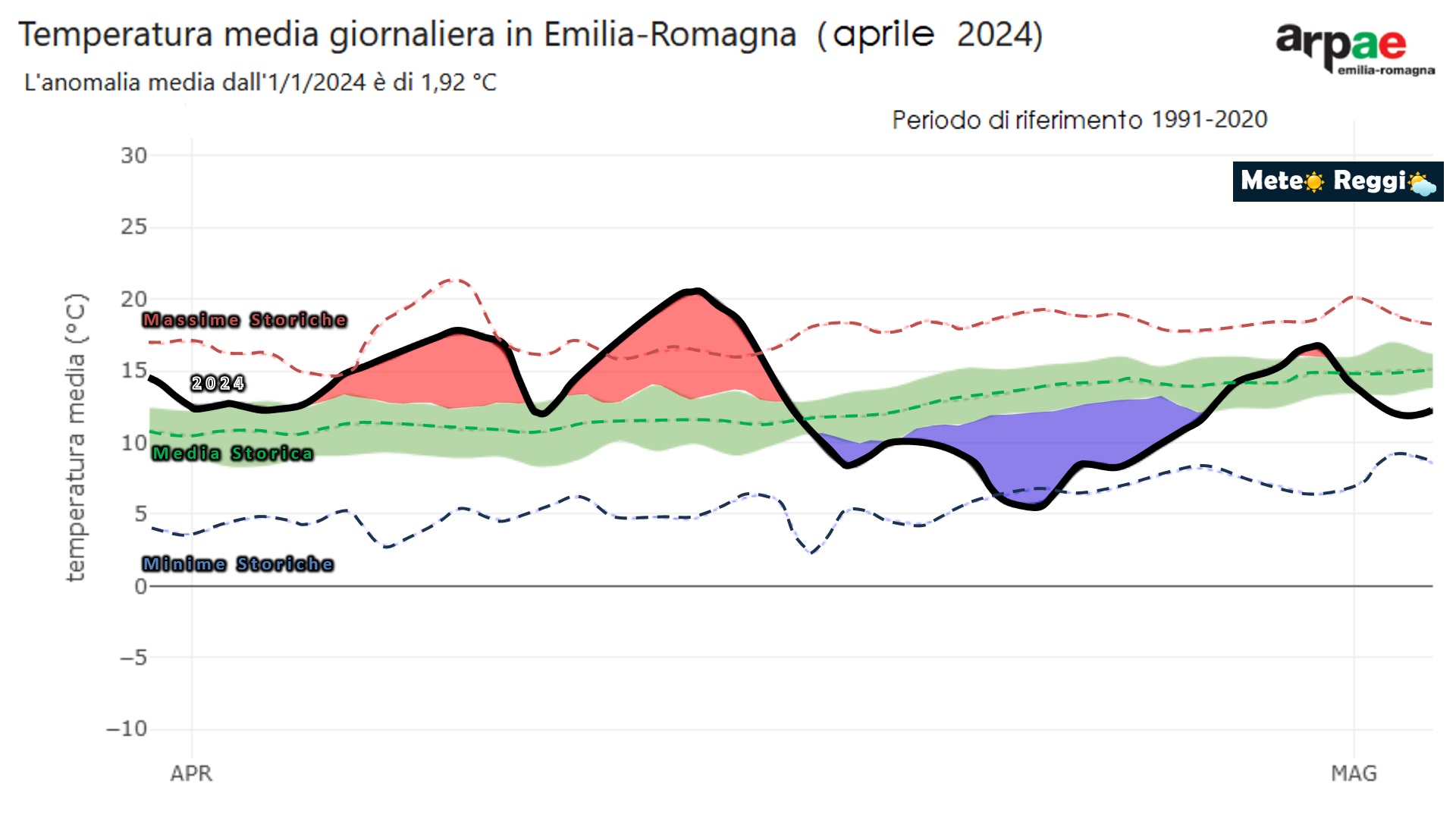 Se poi vogliamo contare giorni di caldo sopra la media contro i giorni di freddo sotto la media, possiamo dire che chiudiamo il conteggio con un pareggio di 11 a 11. Abbiamo avuto 6 giorni sopra la media (04/04 ->09/04), (12/04 ->15/04) e (30/04). Sotto la media i giorni (17/04 ->19/04) e periodo (20/04 ->27/04).