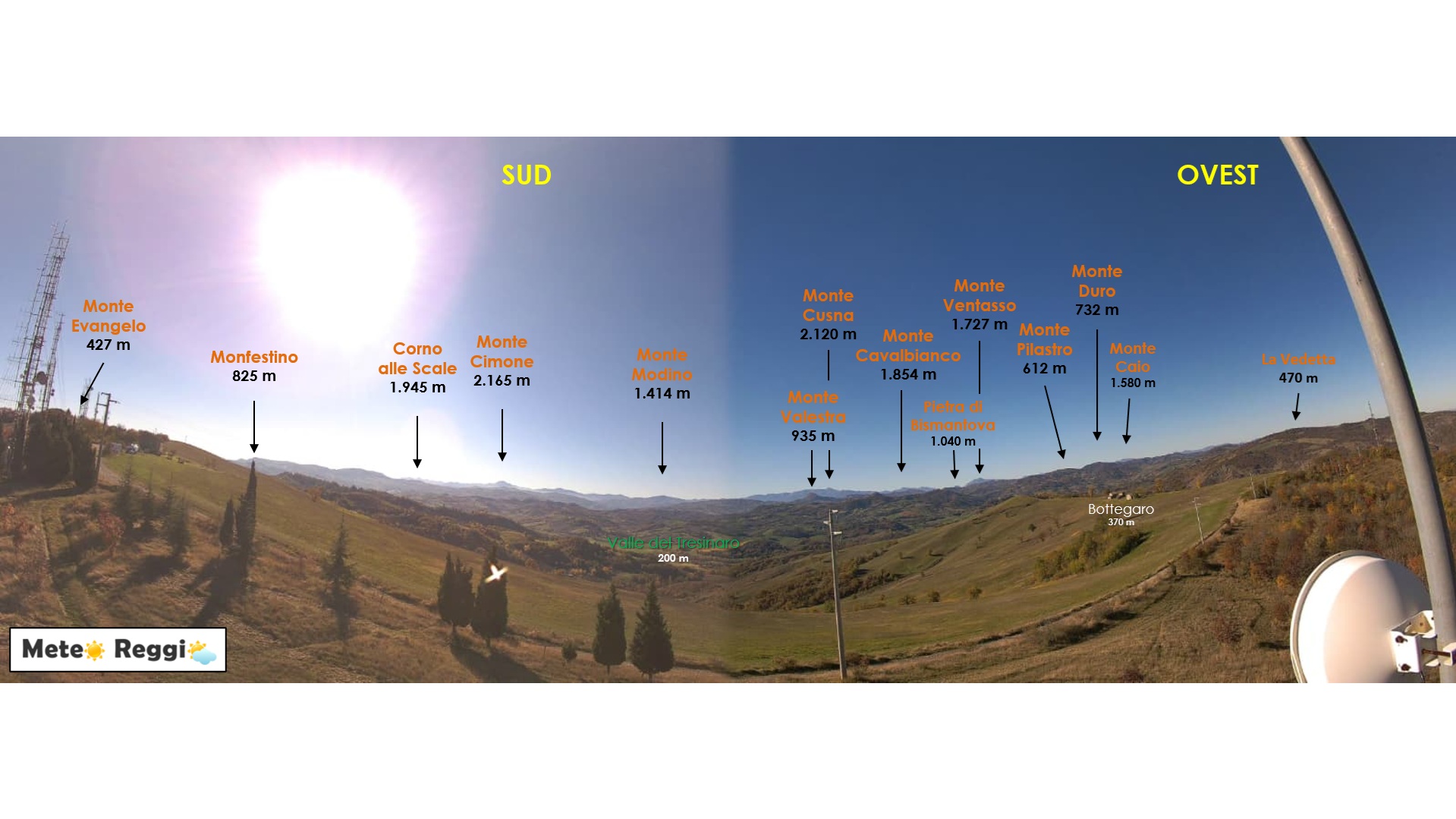 Questa è stata la nostra seconda installazione in ordine di tempo, ci troviamo sempre sullo stesso traliccio del puntamento nord, ma con uno sguardo privilegiato verso l'Appennino tosco-emiliano. Sul fondo abbiamo la valle del torrente Tresinaro che serpeggia fino a Felina. La telecamera si trova a 400 metri sul livello del mare e spazia dal bolognese al parmense, nel mezzo il Gigante ed il Monte Cimone. Un ringraziamento speciale a Radio Luna per l'ospitalità.