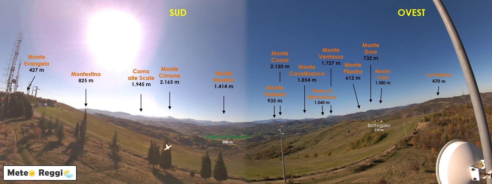 Questa è stata la nostra seconda installazione in ordine di tempo, ci troviamo sempre sullo stesso traliccio del puntamento nord, ma con uno sguardo privilegiato verso l'Appennino tosco-emiliano. Sul fondo abbiamo la valle del torrente Tresinaro che serpeggia fino a Felina. La telecamera si trova a 400 metri sul livello del mare e spazia dal bolognese al parmense, nel mezzo il Gigante ed il Monte Cimone. Un ringraziamento speciale a Radio Luna per l'ospitalità.
