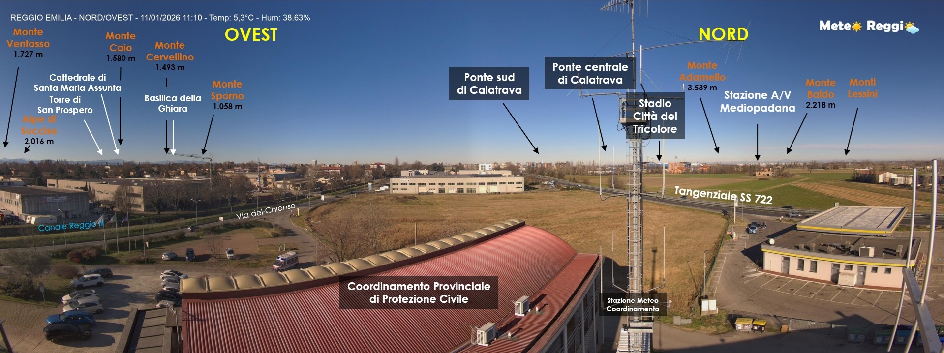 Questa è la nostra quarta location d'installazione webcam ed è la prima della collaborazione stretta con il Coordinamento Provinciale di Reggio Emilia. Qui il nostro ringraziamento va al presidente del Coordinamento Alessandro Sandrolini ed al Gruppo di Lavoro di Telecomunicazioni (TLC) di cui il referente è Guido Monti. Siamo nella periferia nord di Reggio Emilia presso la struttura che ospita il Coordinamento e la Croce Rossa Italiana di Reggio Emilia. Il panorama vero occidente spazia dal centro storico di Reggio Emilia fino alla stazione TAV Medio-Padana. Sullo sfondo si va dall'Appennino reggiano/parmense fino alle alpi lombardo/venete. Ottima visuale sul traffico della tangenziale e via del Chionso durante i grandi eventi che si svolgono al Mapei Stadium ed alla vicina RCF Arena.