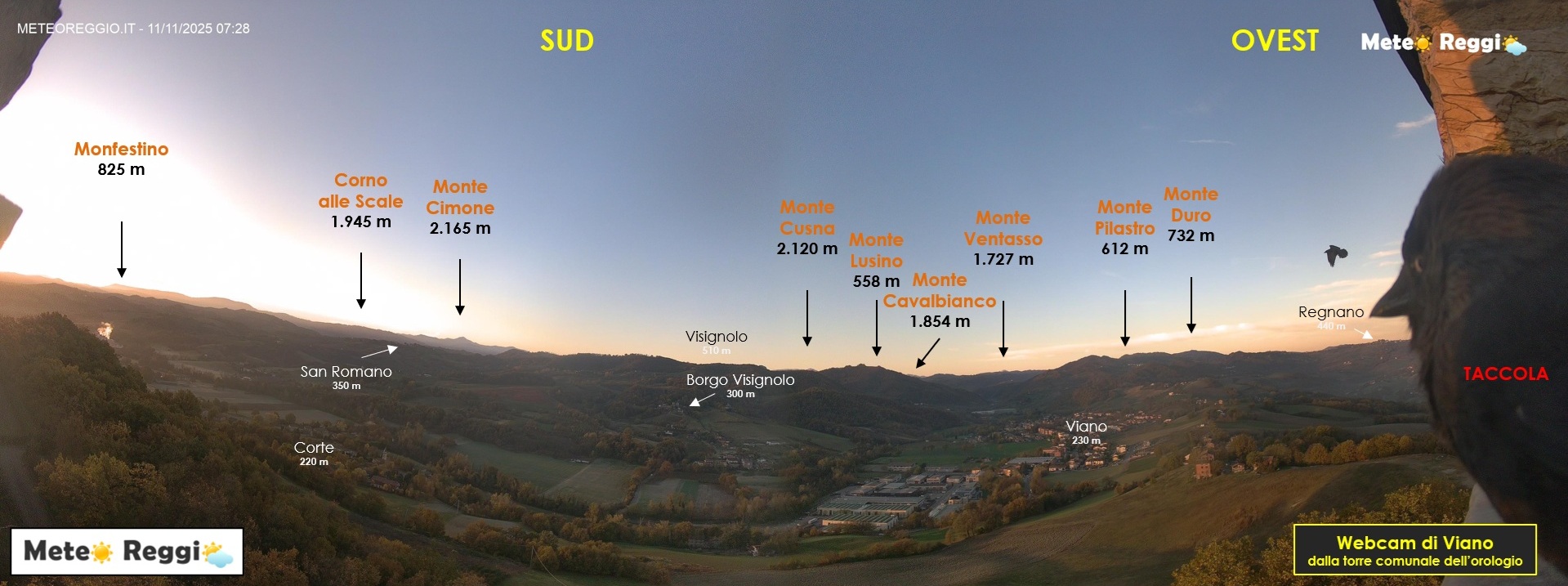 Terza location in ordine di tempo grazie all'aiuto dell'allora Sindaco di Viano Giorgio Bedeschi e del suo vice Nello Borghi. Siamo sulla torre dell'orologio nel complesso del Castello di Viano, dimora storica delle Taccole di MeteoReggio (come potete vedere). Questo puntamento ricorda quello del monte Evangelo (Sud), ma ci permette di apprezzare i dettagli della "Città della Meccatronica" e la valle scavata dal torrente Tresinaro. Ci troviamo a 350 metri sul livello del mare con una vista che spazia in profondità dal Corno alle Scale fino al monte Ventasso.